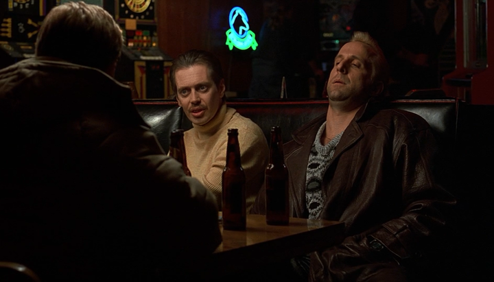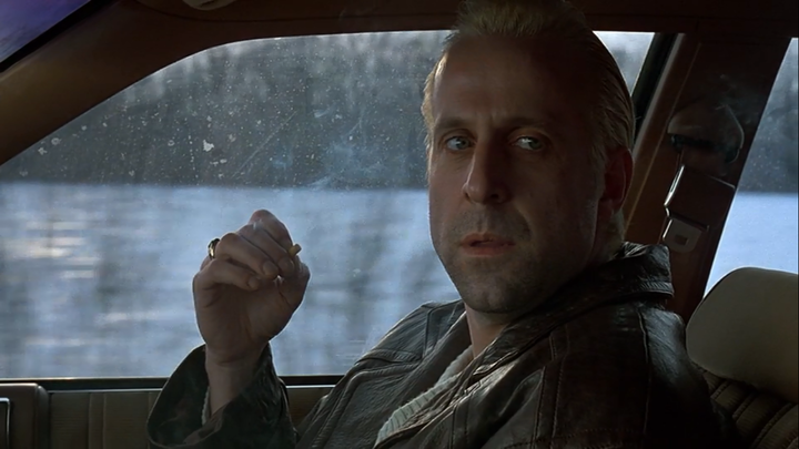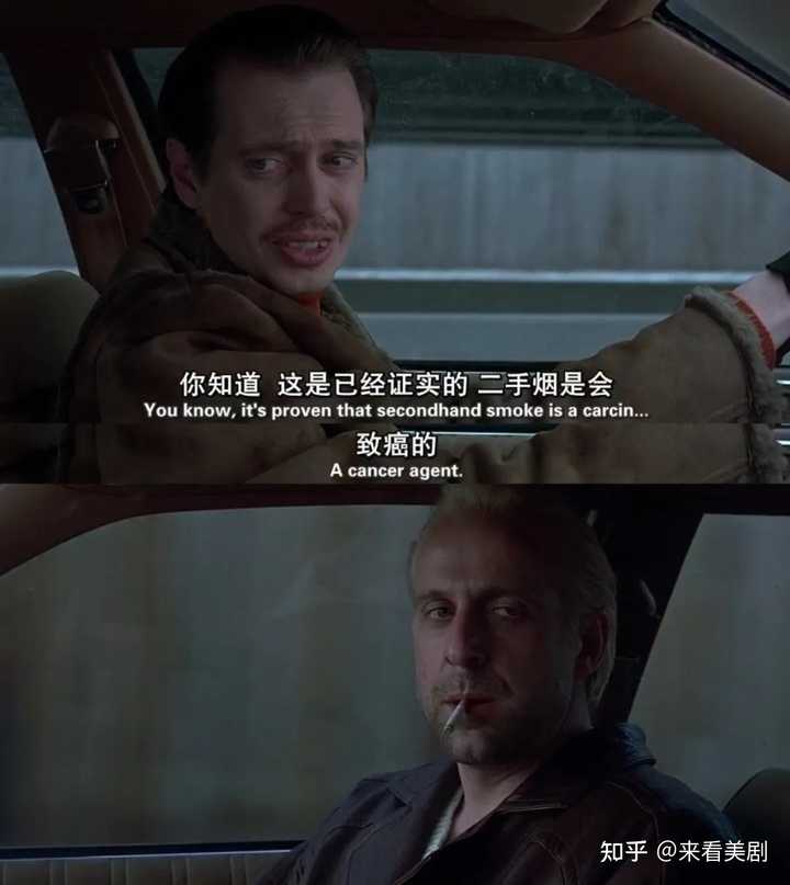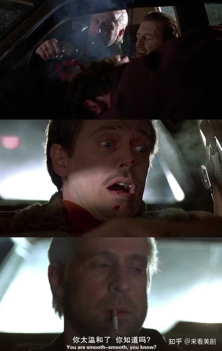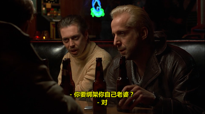 右一为甘实鲁,右二为卡尔 两个绑匪里,卡尔·苏华德更加健谈,并总是试图将自己的行为打扮得更像人而不是动物。 甘实鲁不然,他话很少,多数情况下都是一脸冷漠。一言不合就会杀死对方,就像《老无所依》里的主角一样。 甘实鲁甚至不能算是法外之徒,他压根就没有法律观念,他用动物的丛林法则解决一切问题。 有意思的是,后面这场交易的介绍人谢泼(一个印第安人长相的前犯罪分子)出场了。 谢泼介绍给杰瑞的绑匪,是甘实鲁。他并没有提到也不认识卡尔·苏华德。 跟随剧情深入了解这三个人物后,观众不难发现,令甘实鲁和杰瑞直接对接以完成绑架,是难以想象的。 甘实鲁过于动物化,而杰瑞又不可能一开始就坦坦荡荡以动物的面孔与其完成谈判。 卡尔就像是一个缓冲器,一个具有动物/人双重身份的翻译,一个现代社会/丛林世界的桥梁。他可以露出动物的面孔威胁人,也可会用人的方式影响动物。 绑匪二人组开始行动的路上,甘实鲁的行为和需求都是动物性的,华尔则试图驯服他,至少是基于绑架暂时达成共识。 甘实鲁要吃薄饼,卡尔说早上刚吃过,他要吃更过瘾的啤酒牛排。随后,甘实鲁就一脸要弄死他的表情。 |