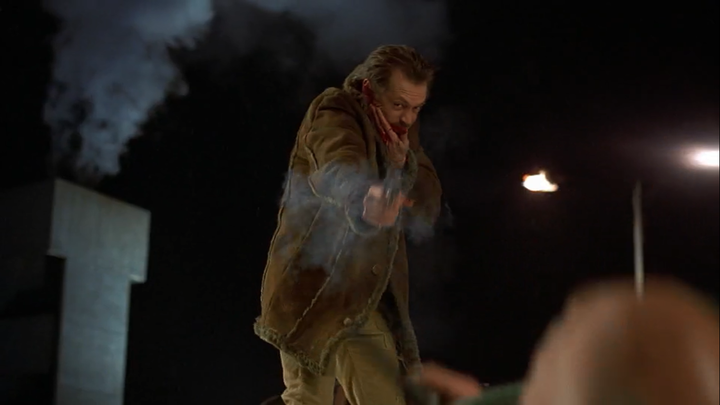 相比喋喋不休的卡尔,沉默寡言的基亚才是狠角色,他无视一切约定和规则,所有的问题都通过杀戮来解决。 在公路上,一眨眼的功夫他就干掉了三条人命:一个巡警和两个目击证人。 仅仅因为他在看电视的时候嫌人质珍吵闹,就把珍杀死。后来又因为跟搭档卡尔分赃不均,一斧头砍死对方,并将其扔入碎木机,毁尸灭迹。 在整部电影里,基亚杀的人最多,手段也最残忍,几乎泯灭人性,冰冷至极,他有时不说话仅仅一个眼神就能让人感到害怕,他就像一个杀人工具一样,这一点将他和影片中的所有人区分开来,仿佛他是另一个世界的人。十年后,他进化成《老无所依》中那个顶着蘑菇头让全世界都恐惧不已的杀手齐格。 |
