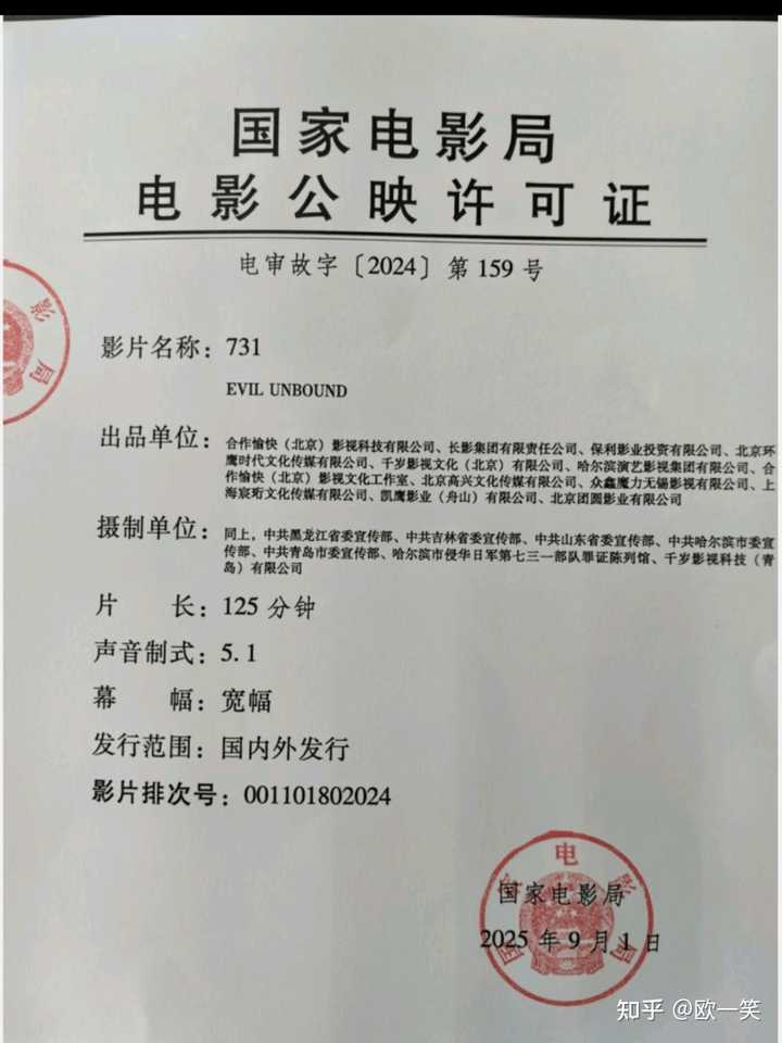 我之前就说过,《731》压着没上又疯狂营销,背后极大可能是长影和保利领导承受不了票房巨亏造成的国有资产流失。从9月1号刚办下来的公映许可证来看,合作愉快公司从出品方末尾摇身一变成为了第一出品方,这意味着合作愉快公司吃下《731》绝大部分份额,由董事席末位上升成董事长,恭喜国企解套成功。 |