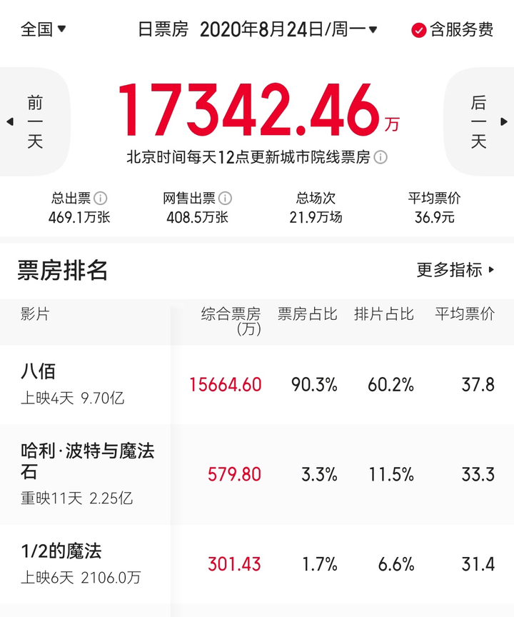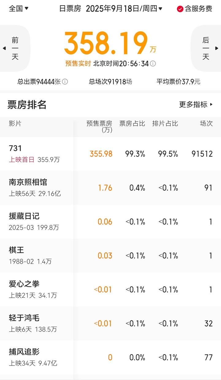 目前排片99.5%主要是因为其他片子完全没开始排,现在差不多排了9万场出来,单日以工作日的容量大约在37、38w场左右,像春节档拉满那种能到50w场,《731》时间点特殊加上热度大最多上浮一点到40w场出头,多了大部分人也在上班没大意义,所以其实目前是大概排了23%左右的排片。 |