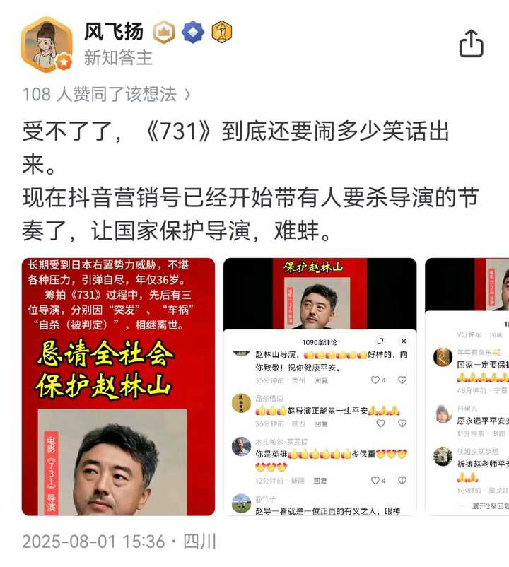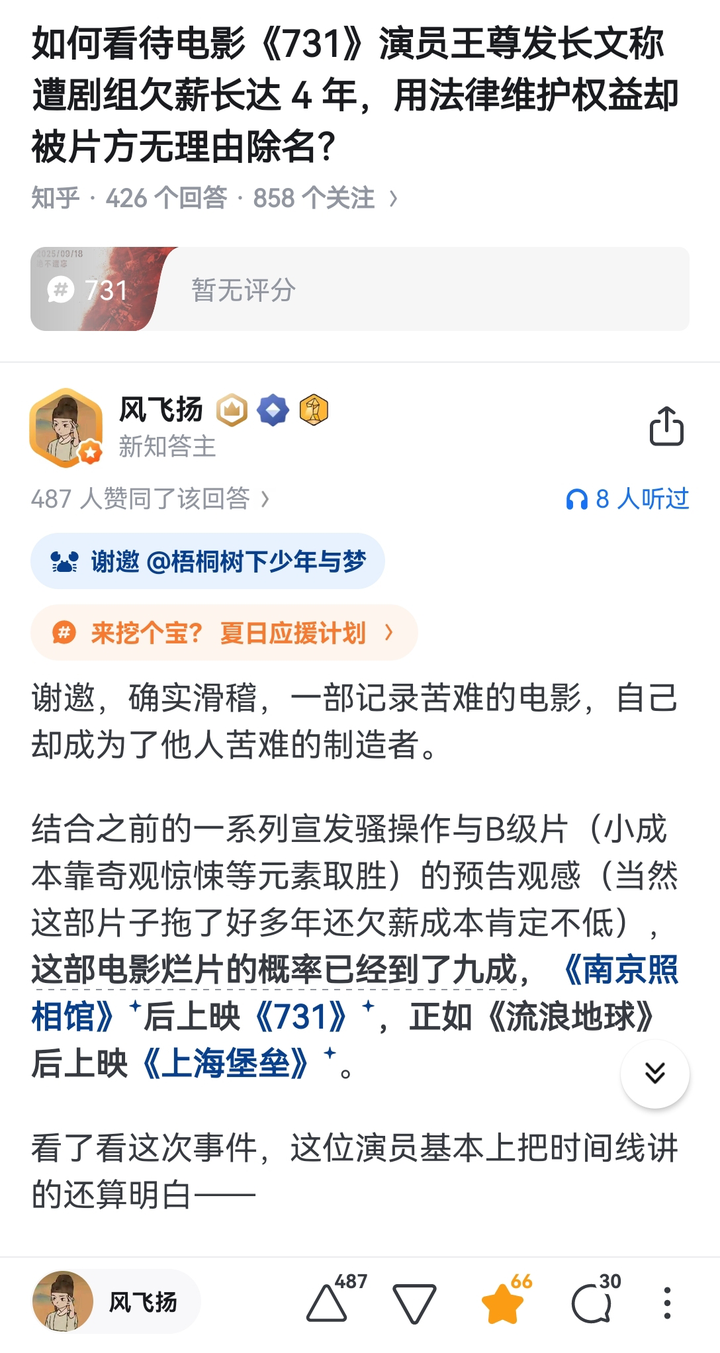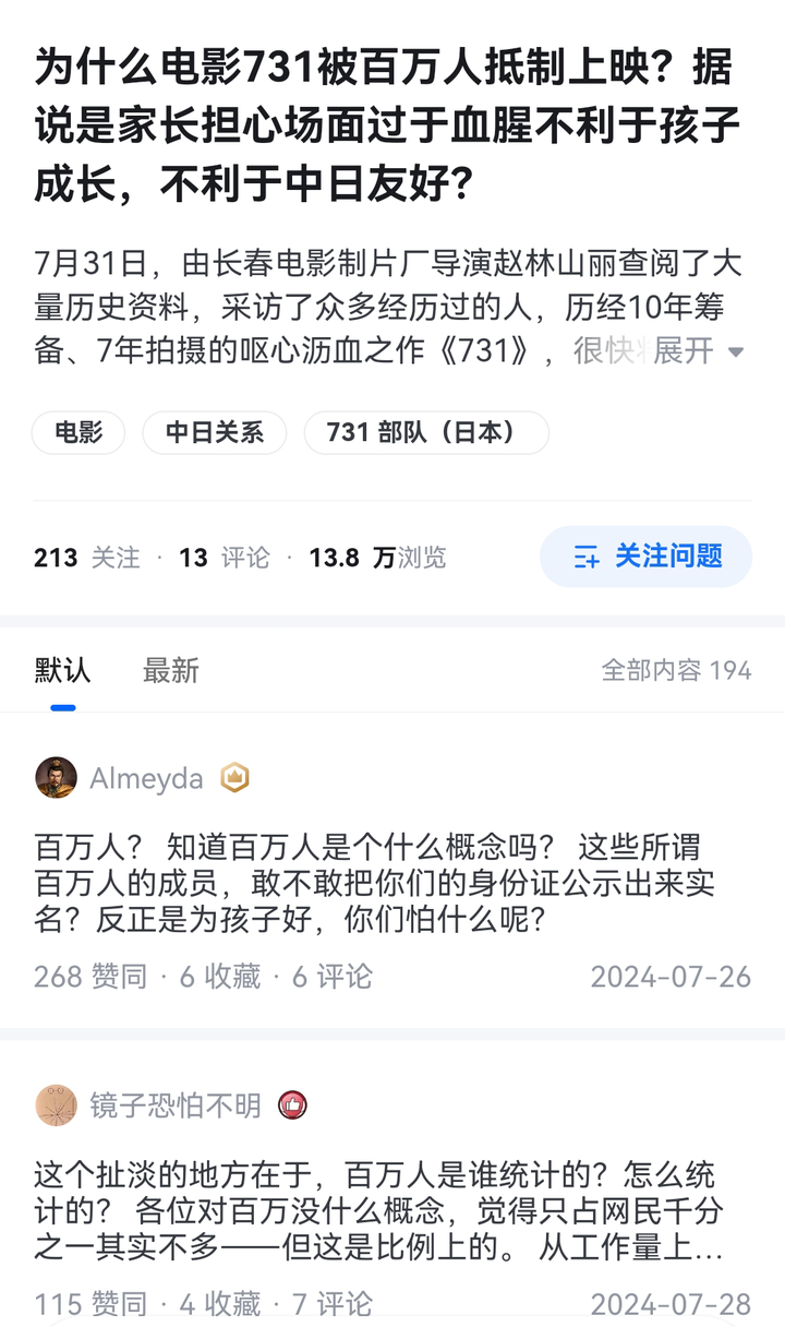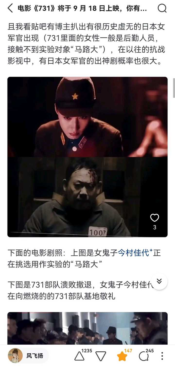 会去电影院看,但不会对质量抱太大希望,也不会非得瞄准918当天看。 其实中国电影这二十年,有一个极其现实的规律,是很多反建制派(当然大多数是自以为自己在反对)不愿意承认的,就是在电影领域,爱国饭真的没那么好吃。 你要说什么微博爱国大v,抖音爱国大v,或者画个画什么的,这些爱国饭好吃,我承认。因为这里面有个前提,就是他们产出的东西,本身就不值钱,要么写要么画要么一个人拍视频。而这些成品也都是免费的,靠的是赚流量费与未来接广告的钱。大家也都知道,键政领域的人接广告是最费劲的,粉丝多也没用,因为粉丝的付费意愿都很低,听你高谈阔论指点江山大伙儿爽一下可以,但想让我买你产品那就算了。 而电影恰恰是一种高投入高回报,走付费渠道的文艺形式,一部中等规模的片子,耗费的人力往往要数百至数千人,你依靠一群光动嘴不花钱的人追捧,在这样的大投资项目面前是赚不到钱的。 我印象里,除了极少数的几部,我认为的确拍的很冗长难看(基本可以说不超过五部)的主旋律电影得到了极高的票房以外,大部分能卖,且可以往主旋律上面靠的电影,质量都还可以。最次也是同档期没什么好片,看这个勉强算OK的水平。 而我说算烂片主旋律但还大卖的那几个特例(我就不说是哪几部片了),无一例外卡司都很强。那个明星阵容,哪怕是拍别的烂片,也一样有人买账,爱国主义这个宣发只能说是一层保护罩,爱豆才是卖座的核心。你几时见过一群知乎上吹捧的老戏骨搭伴拍个小成本爱国片,喊喊口号就能卖上十亿的?没有。因为主旋律这个题目就欠缺娱乐性,和《澳门风云》之类虽然烂但是能看个热闹,出来也能随便喷喷的卖座胡闹片不同,它的严肃在市场上并没有加分,反而是减分的。在刨除机关单位包场的前提下,观众对主旋律电影的付费宽容度,其实要比看随便一个比较烂,但没什么闷场的喜剧要低很多。 之所以总有人说什么「XXX电影就是因为发爱国财才卖的」、「只要加上爱国噱头,中国观众就会买账」,是因为这种人他压根也不怎么进电影院看电影,跟从来不看球但认为自己去当国足教练也不会差太多的网友是一个心态,表达的不是一种经过体感或调查后的心得,而是一种情绪,一种「中国没有好电影,导演跟演员不是狗奴才就是傻逼,去给电影院付费的观众也大多智力比我差很多」的精神胜利。 主旋律电影卖座也需要质量,也需要娱乐性。这一点,距离最近,还没下片的《南京照相馆》就是明显的例子。 它的异军突起,不是因为什么它把日本人的丑陋拍出来了。因为就算这是史实,也没有那么多观众,那么闲,就为了看八十年前日本人的丑态特意去电影院看一部难看的片子。 它能卖座的先天基础是这个故事真的讲的非常好,且出场的主要人物各个有弧光,各个有自己的高光戏份,甚至故事节奏哪里会让观众共情,哪里会给来个反转,导演计算的都特别明白,你看的时候不会觉得闷,不至于走神,会被剧情发展牵引。这是一个成功商业片的必要条件。没有这个条件,就算你口号喊的再响,也没法真的吸引到太多观众入场。 有人可能说了,那是不是起码能吸引那些拍孩子剪奥特曼卡片或者大哭大喊的家长入场?很抱歉,那都不会。因为这类三低观众是爱跟风的,跟风的前提是有风跟。你需要电影质量还过得去,有了基础口碑,没被票房榜干下去,抖音天天上热搜,这类人才会买票进场宣示带孩子接受爱国主义教育。否则难道中国这么多年就《南京照相馆》这一个抗日电影?很明显不是,是因为这部戏火了,而且有抗日属性,他们才会围过来试图在这样的热门话题里找点存在感。存在感永远是三低人士最向往,也最稀缺的东西,你得先有讨论度,我蹭你这件事才有存在感可言。 所以《731》给我的感觉,是它一直在强调电影拍的多么多么不容易,几百万人在举报,还多少都是日本ip,好像导演下一秒就要被日本人暗杀了。这些营销本身就是在筛选能够相信,且愿意相信的观众为此买单。正常人看到这样的营销实际上是很反感的,因为它舍本逐末,到底也没人知道这部片是讲了个大体什么样的故事,只知道是731人体实验的题材,但你如果有所质疑,马上就会被其受众认为是日本人。 我觉得这样的营销属于绝户营销,一枝独秀,因为哪怕是有些抗日电影拍的不算如人意,但起码这么多年里日本侵略罪行的电影,中国还是拍了不少的。为什么日本人不盯着它们其他罪行被揭露的事情说事,只针对这一部电影呢?申奥把日本人的虚伪跟残忍拍的淋漓尽致,他有没有出来说自己被日本人如何如何?《南京照相馆》有没有被「几百万日本ip举报」? 这种「敌人非常重视我」的宣传,本质上就是否定了其他抗日爱国题材电影的揭露性与批判性,好像日本人不怕别人,只怕赵林山,「你拍别的揭露日军罪行,揭露日本人是畜牲的电影我们不管,但就是731不能拍」。 当然,严谨一点是就「赵林山这个可怕的中国导演的《731》版本不能拍」,毕竟之前拍这个题材的牟敦芾也没被日本人这么重视。 包括之后剧组演员讨薪的事情,也让我对这个电影的好感进一步下降。就片论片,我感觉赵当了这么多年导演,我上次看到他的戏还是《铜雀台》,质量很难让我对其有进一步的期待。 不过为什么我还会去看?因为耳听为虚,眼见为实,万一这十多年赵导真的一下子从烂片大王变成了十年磨一剑的电影大师,这都