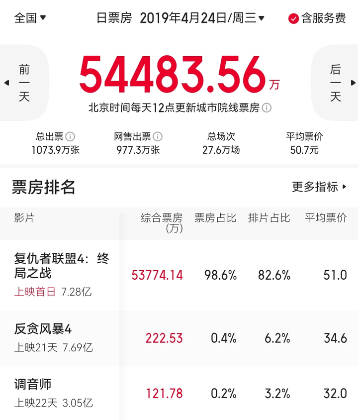 而到9月18号,暑期档影片又过去了大半个月的时间,基本也都已经是强弩之末,不是人人都是《哪吒2》能一路杀到五一,所以《731》到时候就是完全没有敌手,排片虽然不能达到99%,但对标一下这几年的单杀大盘片子的排片应该没大问题。 比如在冷档期4月工作日横空出世的《复联4》,非节假日而且这会儿马上“五一档”,国产片不会上,加上4月本身就是冷档期,当时《复联四》一度达到83%的排片—— |