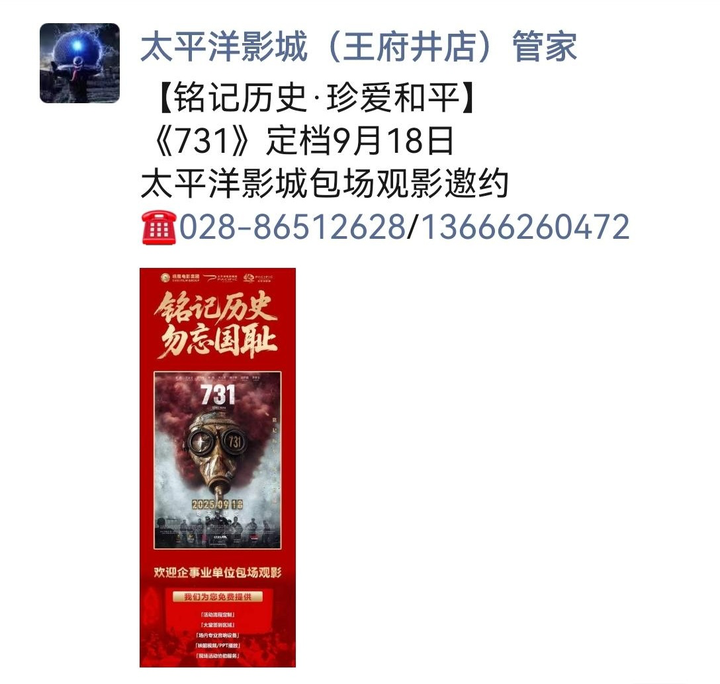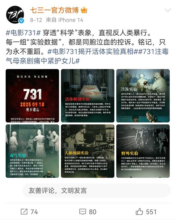 所以对于《731》来讲,这个档期60%的排片一定能拿下,搞不好一下子能直逼80%的排片。 可以说,对它来讲,要么吸干,要么骂死,没有中间状态。 要么成《爱情公寓》,要么争真人票房第一一路杀到国庆档。 我为什么没说《东极岛》跟《南京照相馆》,因为这俩热度其实都不够,《东极岛》有粉丝狂冲预售首日排片也才33%,《南京照相馆》更是一开始毫无水花,点映了一周才口碑发酵,排片最高时也只有41.3%。 当然这片子骚操作实在太多,就冲这些骚操作与大热度,我也得去瞧一瞧—— 奇怪的宣发—— |
