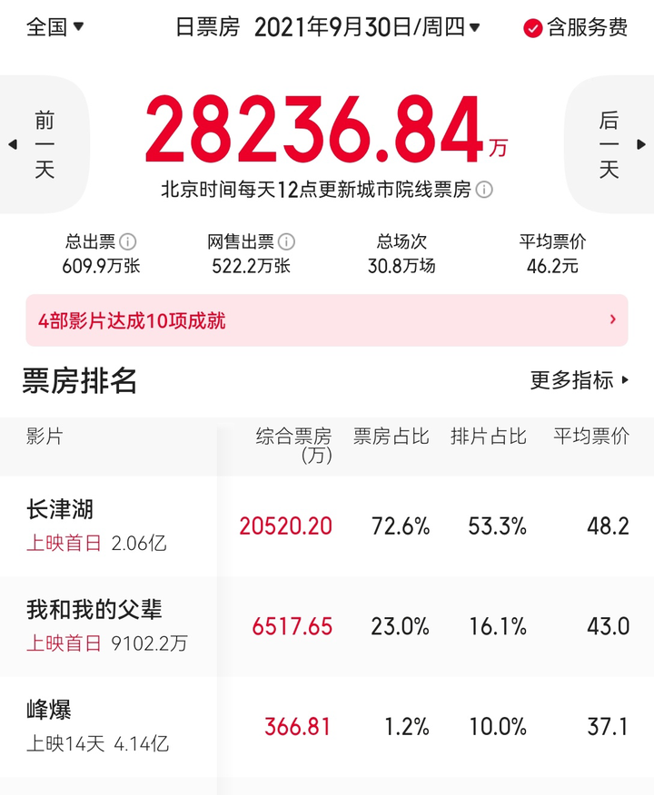 《八佰》跟《独行月球》也都一度超过60%。 《长津湖》也类似,虽然也有《我和我的父辈》竞争,但其实也是没其他新片—— |