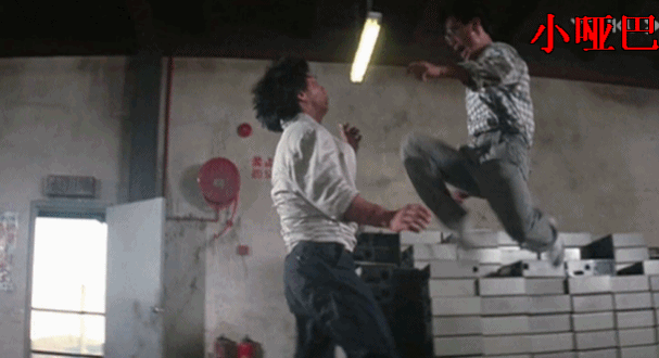其中有一个镜头,就是最后烟火工厂打斗那里,哑巴需要完成一个当时难度极高的动作 —— 起身跳入半空,然后利用滞空时间连踢成龙的腹部3下。成龙曾说,全世界的动作演员能够做到这个3连踢的都微乎其微,但是黎强权很牛逼,他可以滞空连踢4下(就是下图这个镜头) |