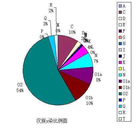 汉族的父系基因,70%以上的汉族皆为O系基因组成——自秦开始绝大多数的汉人王朝皆为O系基因(根据二里头遗址推断,夏王朝的王族也是O系基因),而剩下占大头的C系(南C)基因和N系基因则分别为商王朝王室和周王朝王室的基因。 |