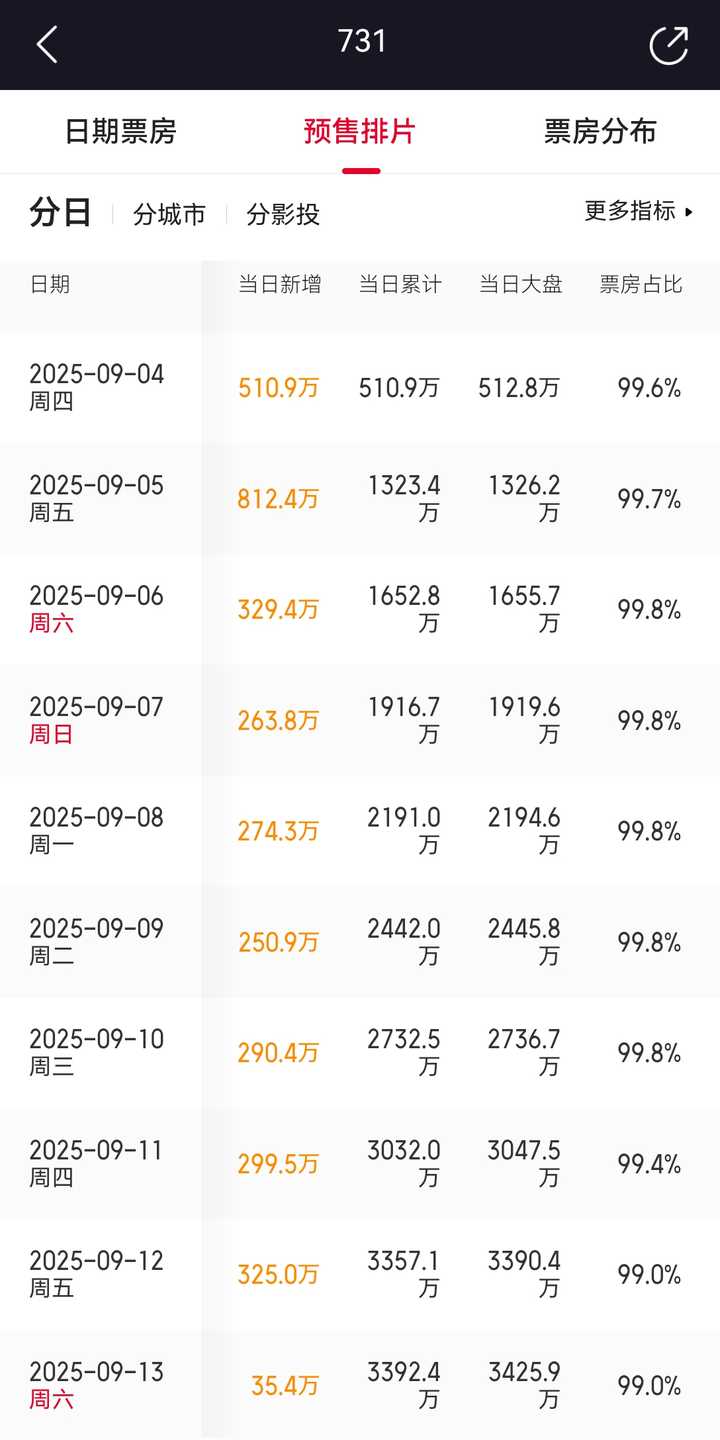据灯塔专业版实时数据,截至9月12日18时29分,影片《731》预售总票房突破5000万。 [图片] |