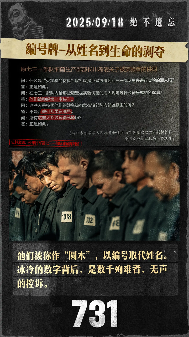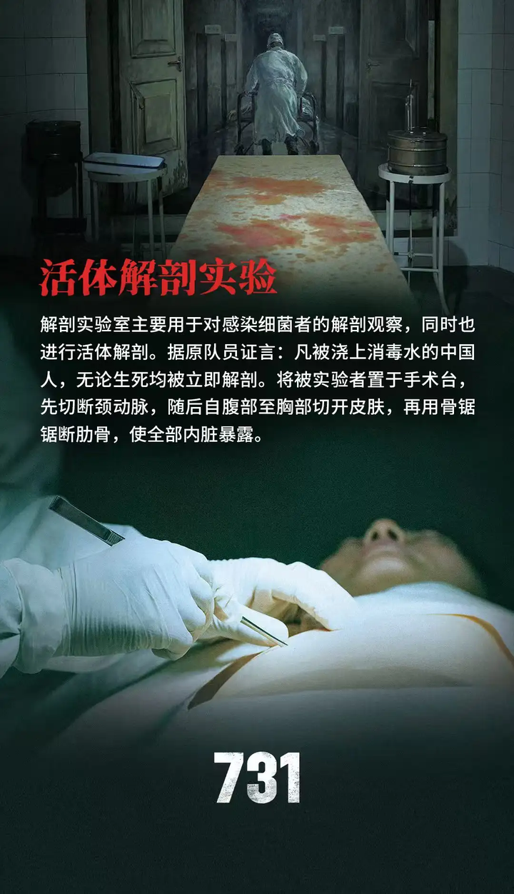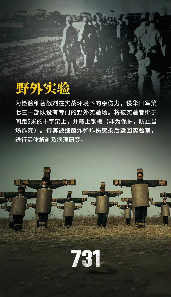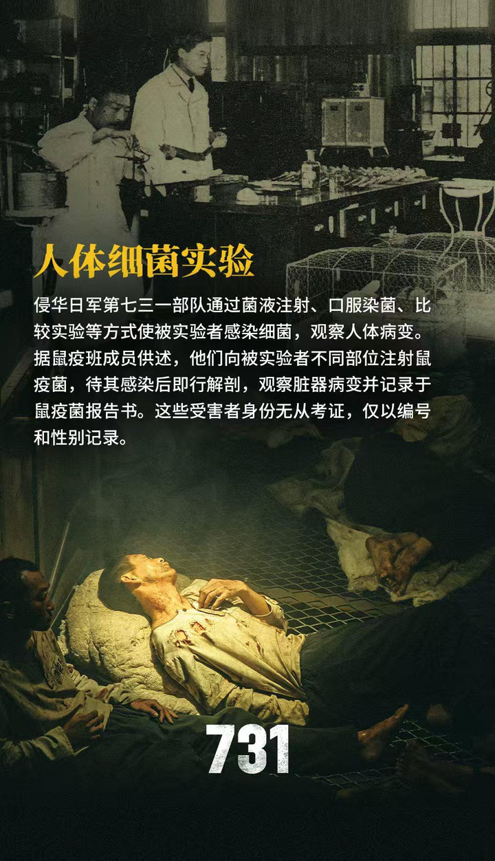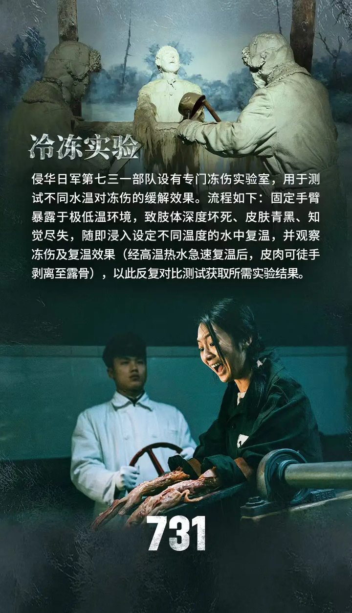 2.《731》制片方发布的物料和宣传片质量都很低 《731》制片方发布了系列宣传图包,但这些图片的质量嘛.......这种一张图上面几行字的宣传图,我用QQ图片编辑功能就能做出来,制片方舍不得招几个会PS的人吗?但凡用好一点的ai,也不至于做出这么简陋的图,这些海报也毫无统一的美术风格设计 有些图文,ai味也很重,像是deepseek生成的,特别是标题和文字的组合风格——当然也可能是文案的水平很有限。关于冻伤实验那副图,这真的不是ai生成的吗,人的表情非常假,而且上半身妆容精致,一点也不像刚刚经历过残酷的实验,而双手在经历冻伤后居然出现克苏鲁的效果???严重冻伤后肢体会黑色变硬,根本不会出现图中的效果 |