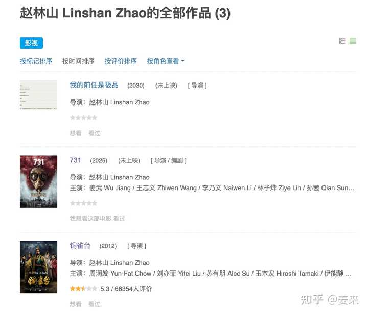 电影《731》将于 9 月 18 日上映,你有哪些期待?457 赞同 · 17 评论 回答 导演赵林山被曝光抽雪茄、喝茅台,还把女儿送去国际学校 王尊实名控诉《731》欠薪,5年零收入?导演剧组抽雪茄喝茅台www.163.com/dy/article/K7L2GC900556CICE.html 5.赵林山过往履历很糟糕 把《731》算在里面,赵林山总共就执导过3部电影,前两部都是烂片 豆瓣上还发生了神奇的事情:《我的前任是极品》这部电影明明上映过了,居然被豆瓣硬生生改成了未上映 |