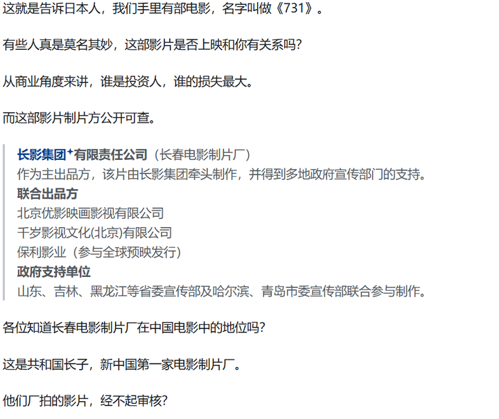 之前很多人尬吹《731》背后有共和国影业长子长春影业、多地宣传部等机构在支持,但其实赵林山以前是长影的,长影与《731》的关系由此而来,看不出来长影有多重视这个项目。至于“xx宣传部支持”,大概率就是看到有爱国影片在拍摄所以派人露了个脸。从公映许可证上的信息来看,长影反而对这部影片退避三舍,让赵林山自己的工作室排在第一位,自己躲在后面 |