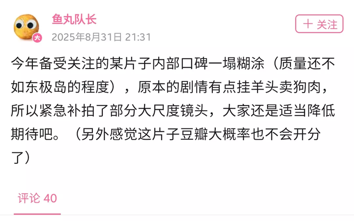 1、这部电影营销太厉害,上半年很早就经常刷到,相关爱国话题底下的评论区,视频的内容不提,《731》倒是搞得好像人人都欠它一张电影票,挺反感的。 2、临上映撤档,不管什么理由,反感程度再加一截,我也不知道为啥面对《照相馆》撤档后,依旧那么多人期待,我如果代入上述营销后被影响、感兴趣的群众,面对这种操作我只会觉得期待落空,反感倍增。 3、阅兵后,且是抗日、反法西斯胜利80周年,按理来说看完阅兵各种新式武器的我,也可能抵消了第二点反感,虽然因为第1点的反感还会有,但可能会视自身业余情况再决定去不去看。 只是阅兵后看到冲上热搜的“糖糖985诬汉大学的日本椅子”,也不见相关部门给予惩治。 综上所述, 我基本不会去看了。 不管它是凉还是爆,反正也就少我一票,国内电影也不缺这一票。 我敬重历史,也痛恨小日本,但我讨厌被营销、水军、资本、部分“爱国”观念裹挟。 |
