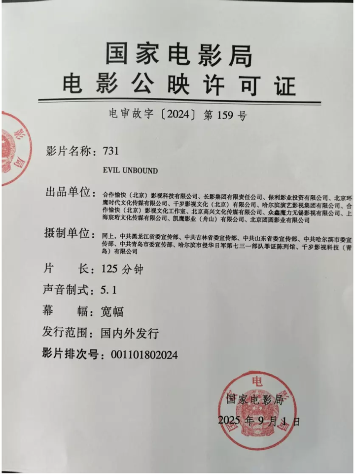 这部电影质量究竟如何,还得上映后看到全片才能见分晓,不过就其目前展示的物料来看,恐怕不值得为它预购电影票 1.《731》背后没有大制作方支持 虽然官媒报道了,但《731》电影制作过程中,其背后并不存在什么国家支持,结合其多次重新拍摄、跳票的经历,很有可能长影认为赵林山拍得太烂所以不愿意为他提供支持,导致赵林山只能靠反复炒作来吸引投资 之前《731》电影被发现找不到备案号,这次网上流出了其公映许可证。赵林山应该不至于胆大到伪造公章,这么说来它确实已经过审了。至于为什么备案找不到,可能是用了别的名字备案(奇怪的是《生化启示录》的名字也搜不到,搜赵林山和另一位编剧的名字也搜不到),可能是有关信息隐藏了,也可能制度是死的,人是活的,之前央媒已经报道了《731》上映的消息,被架在火上了,不得不放行 |