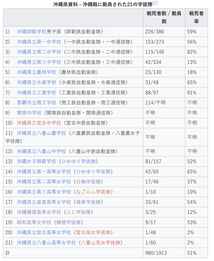 在日本军队内,女性只能从事护理、通信、防空等辅助工作,其余都是男性。但话说到这里,要指出一点,这并不表明日军没有强征女性。例如,在二战末期,日军在冲绳多所女子高中强征女学生上战场,从事护理工作,在战败后还逼迫她们“集体自杀”或把她们赶出阵地(这无异于让她们去送死) ひめゆり(姬百合)学徒隊 冲绳县女子师范学校源于1910年设立的冲绳县师范学校女子部,于1915年作为师范学校的附属机构正式创建。1916年迁至真和志村大道的冲绳县立第一高等女学校校址,与该校合并办学。实际上,校长和部分教师在两校兼任职务(师范学校女子部长西冈一义兼任第一高女校长)。正门处同时标注两校名称,虽校名相异但实质近乎一体。至1940年代,女师与第一高女的校舍被称为"姬百合学舍","姬百合"逐渐成为两校共同的爱称。 关于"姬百合"名称的由来,存在以下几种说法: ? 两校合并时,将校刊《乙姬》(第一高等女学校)与《白百合》(师范学校女子部)合并为《姬百合》的命名渊源说 ? 因两校校歌相同且歌词中均出现"乙姬""白百合"意象的衍生说[2] ? 为悼念从安里川简陋桥梁坠亡的第一高女学生,昭和初期改建安全桥梁时命名"姬百合桥"的起源说 需注意的是,"ひめゆり"(himeyuri)的平假名表记始于战后。"姬百合学徒队"的称谓亦为战后所用,冲绳战役期间她们被称为"一高女生""师范生"。1945年3月23日美军登陆冲绳前夕,两校222名女生与18名教师共240人组成学徒队,被征召至冲绳陆军医院(通称南风原陆军医院)担任护理人员。该院直属冲绳守备军(第32军),分设本部、内科、外科、传染病科等部门,在近40处洞穴壕沟内设置双层病床收治伤员。随着美军登陆导致前线伤兵激增,内科改为第二外科,传染病科改为第三外科,并在那霸附近的一日桥、识名以及知念半岛附近的丝数设立分院,学徒队员被分散配置至各点。 然而战局恶化之际,6月18日突然下达解散命令, 学徒队约一周内(自6月19日起)出现大量伤亡(死者中80%集中于此阶段)。最终240名师生中136人遇难,其中10人(教师平良松四郎与9名学生)在荒崎海岸集体自尽(存在强制集体死亡争议,详见相关条目)。邻近洞穴中也发生美军扫射事件,致3人死亡、3人重伤。 白梅学徒隊 昭和11年(1936年)4月,因纵火引发火灾导致校舍大部烧毁。昭和15年(1940年)2月新校舍落成,但在昭和19年(1944年)10月10日的冲绳大空袭(十·十空袭)中校舍完全焚毁。此后学生们在临时校舍坚持学习,自昭和20年(1945年)2月起开始对四年级学生进行护理培训。 3月6日,56名四年级学生作为随军辅助护士,加入以东凤平国民学校为总部的第24师团卫生护理教育队。 3月24日,因美军攻势加剧,护理培训中止,学生被分配至八重岳半山腰洞穴中设置的第24师团第一野战医院(山3486部队)(25日与27日分别有3名和9名学生退役,最终46名学生入队)。 6月4日,因美军猛攻,第24师团第一野战医院决定向南部撤退,"白梅学徒队"就此解散。解散命令虽似出自冲绳守备队本部指示,但亦有观点认为实因军方已无力照料这些学生。对于学生们提出的继续随军请求,部队未予接受。46名被迫离开洞穴的学生分成若干小组向南逃亡。在此过程中因美军炮击及自尽行为造成大量伤亡,那些撤退至国吉地区第24师团第一野战医院壕沟并继续服务的学员,也在6月21日至22日的美军猛攻中遇难。46名学生中22人战死,其中17人是在解散命令下达后牺牲的 瑞泉学徒隊 由于校舍位于首里城内的瑞泉门附近,战后被称为"瑞泉学徒队"或"ずいせん学徒队"。从首里高等女学校动员的51名女生中,超过半数的33人战死。 第62师团野战医院壕位于冲绳县岛尻郡南风原町新川(现冲绳汽车道那霸交流道附近),是沿河建造的全长约200至300米的人工野战医院壕,内部设有手术室、药品室、医务室、休息室和病房。为进行护理工作,首里高等女学校的瑞泉学徒队与冲绳昭和高等女学校的梯梧学徒队被动员至此。 1945年3月27日晚8时左右,在铭刈壕入口处的军营帐篷中举行了毕业典礼。没有亲属到场,只有校长和军官出席。次日3月28日起,学生们正式被分配至该野战医院壕。在此地,有三名瑞泉学徒队队员牺牲:两名据称感染传染病的学员被安置在壕沟深处的隔离室,队友们甚至不被允许探视,最终被告知她们因脑炎去世;另一名发烧的学员同样因脑炎离世,据记载"她临终前不断从床上挣扎坐起,反复呓语着'要去找妈妈'"。 |
