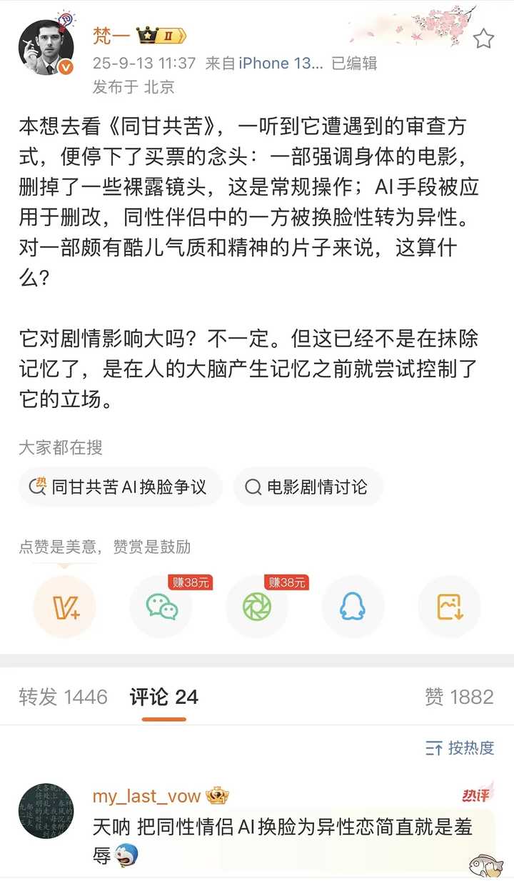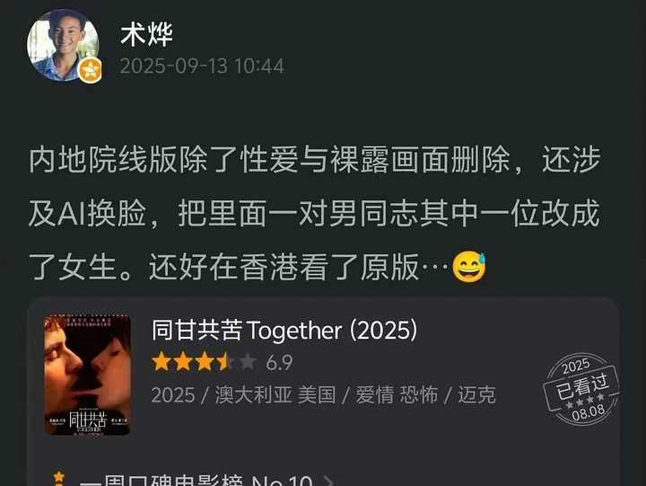 [影视娱乐]如何评价内地公映版《同甘共苦》中将男同性情侣剧情其中一人通过 AI 换脸成女性? |