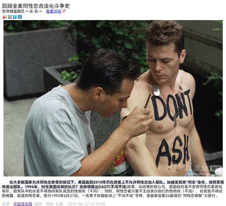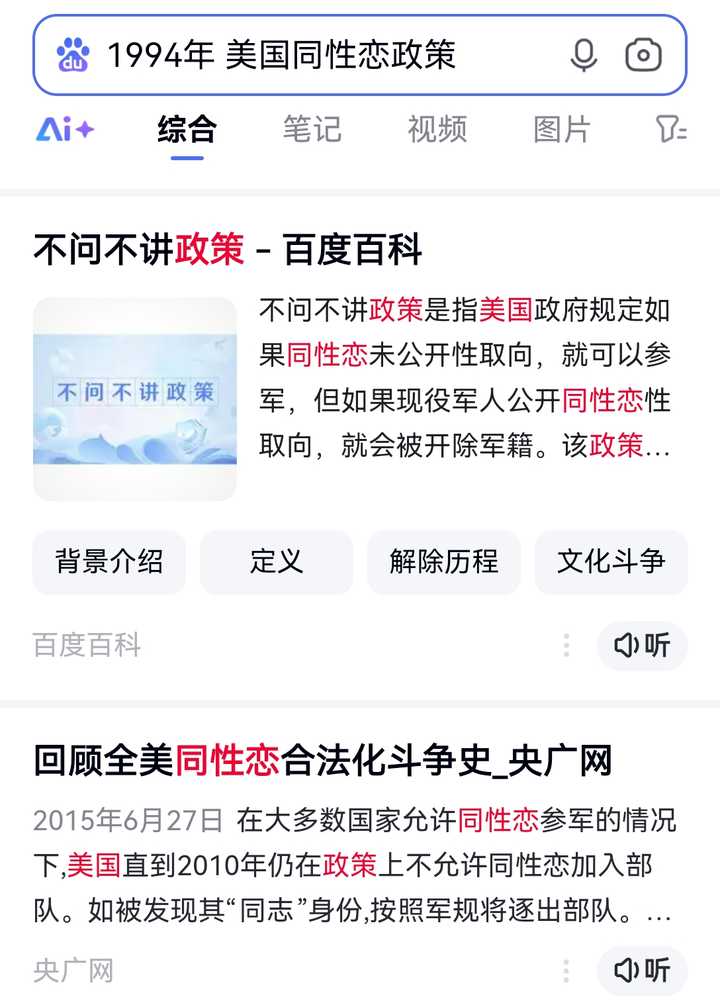 这让我想起了22年老友记重新引进中国的时候,新版老友记删除了罗斯前女友les这条线的内容。 要知道,老友记首播于1994年。我们现在百度美国1994年的同性恋政策内容,搜索出来的是克林顿的“不问不讲政策”,以及央广网、中青报在2015年回顾全美同性恋合法化斗争史的内容。 |