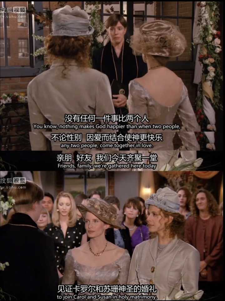 《老友记》就是这个时候开播的,当时美国同性恋运动取得不少进步成果,但依然有不少人反同。官方虽然没有激烈反对,但如“不问不说”政策一样,大部分情况下选择沉默并倾向反对。 所以,在当时的历史背景下Carol决定和同性伴侣Susan结婚,也遭到了家人的反对,没能被家人祝福。 |