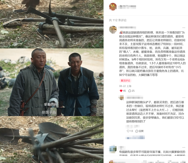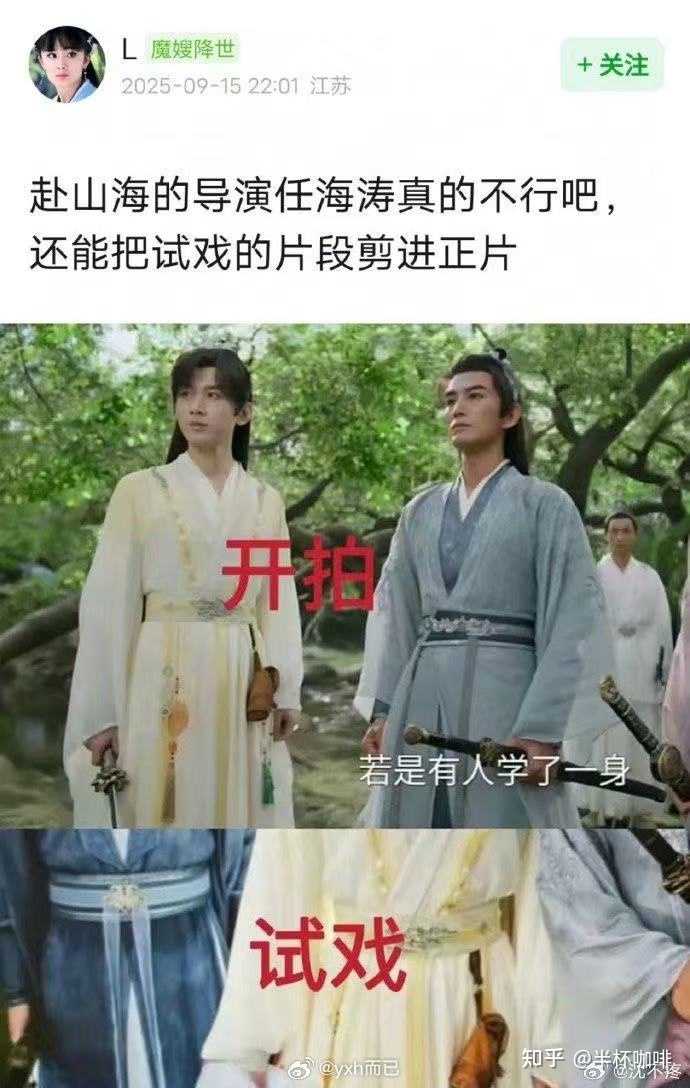 这种问题不是一个主演敬不敬业决定,应该说,整个剧组都在得过且过。 但就像上图工作人员的解释一样——道具组就一个半人,突然要用100套农具,你有什么办法?成本、时间、人力物力,基本上决定了这个剧最好就能达到这个水平了。 所以这种瑕疵,我一向认为是小瑕疵,郭德纲说单口,拿着折扇比划比划就是在念书看信,这个程度都能接受,所以年代剧、古装剧道具出点问题,出了就是出了,我是来看剧看故事的,到处做得精良,我赞美,道具做得敷衍,理解万岁的同时适当减分就行。 《赴山海》更严重的敷衍,体现在剧本上。 前面10集尽可能去找《赴山海》的优点了。 11-14集开始觉得不对劲:怎么无间道这种剧情出现了那么多次? ①名门正派康出渔(ctrl鱼)是权力帮的无名魔王。 ②广陵三山之一的屈寒山是权力帮的三巨头之一剑王。 ③NPC风朗被权力帮副帮主柳随风凭借捡来的腰牌冒充了。 ④广陵三山的另一个大佬杜月山,被北荒奸细尉迟清凭借捡来的腰牌冒充了。 萧秋水老师,你是出门就上当,当当没有新花样啊。 类似的套娃剧情还有ctrl鱼的儿子让萧雪鱼识相点嫁给自己,以及唐门的唐宋让唐方识相点嫁给自己。 15-16集看乐了,不只是剧情有问题,最基本的算术也扑了。 柳随风这个「三炷香的时间」,居然是三根香一起点。嗯,数学渣和血汗工厂的确是这么算时间的。 |