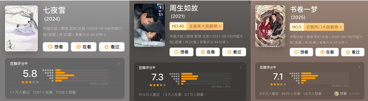 另外去年播出的李沁、曾舜晞主演的《七夜雪》是他和另外两位导演联合执导的,以他为核心,这部改编自知名同名小说的古装武侠剧,豆瓣评分5.8分,只有1.7万人参与过评分。 对比后才能看出伤害,《周生如故》豆瓣评分7.3分,30w人参与评分,《书卷一梦》7.1分,9w人参与过评分。 |