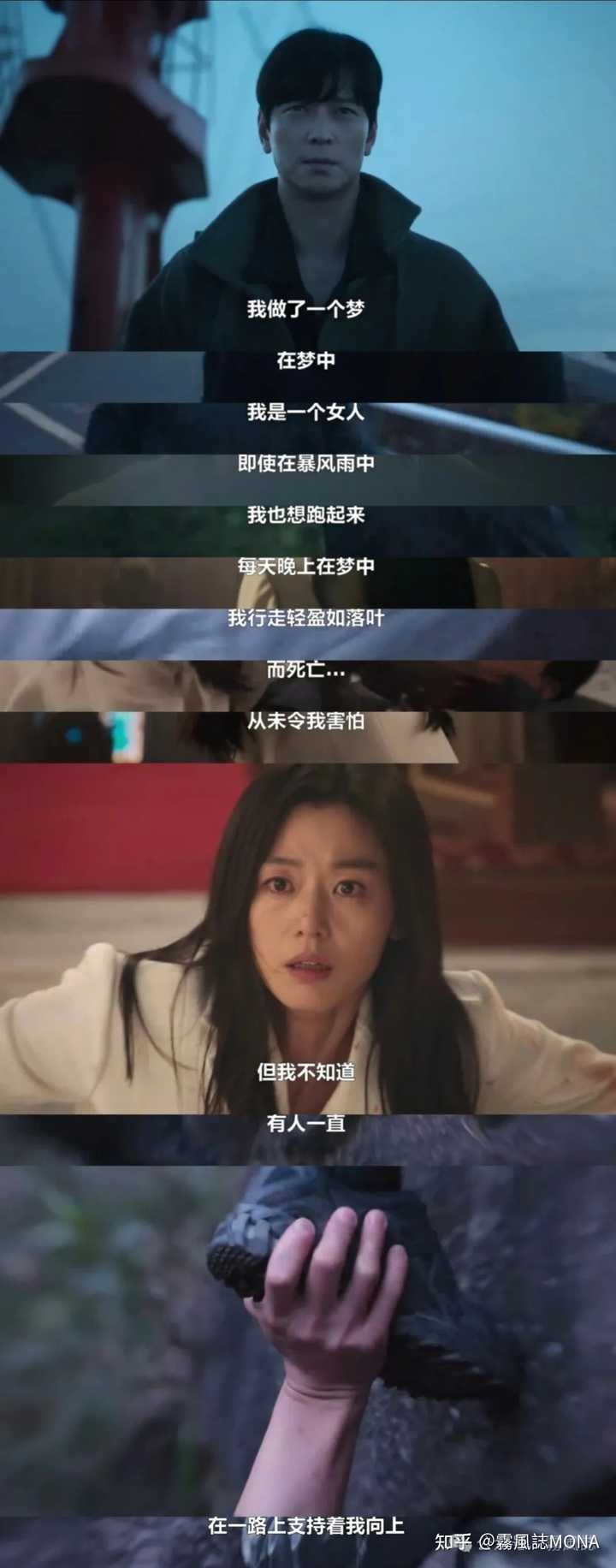 Disney+新剧《暴风圈》由全智贤、姜栋元主演,《小小姐们》导演金希元&编剧郑瑞景再次携手,结合政治、动作、悬疑、爱情多种类型,讲述一个决心竞选总统的女人徐闻柱和受雇保护她的特工白山湖一起前行的故事。 郑瑞景从电影《分手的决心》到《小小姐们》,她的剧本一向注重文学性、充满隐喻,善于洞察人性的幽微,温柔细腻的笔触中隐藏着尖锐与犀利,也充分能驾驭爱情、犯罪、政治多种题材杂糅的叙事。 新作《暴风圈》前3集剧本最吸引我的是,徐闻柱和白山湖的双视角梦境叙述中的隐喻。首先,故事开篇以徐闻柱自述她的梦、结合她陪丈夫进行政治活动的画面出现。 |