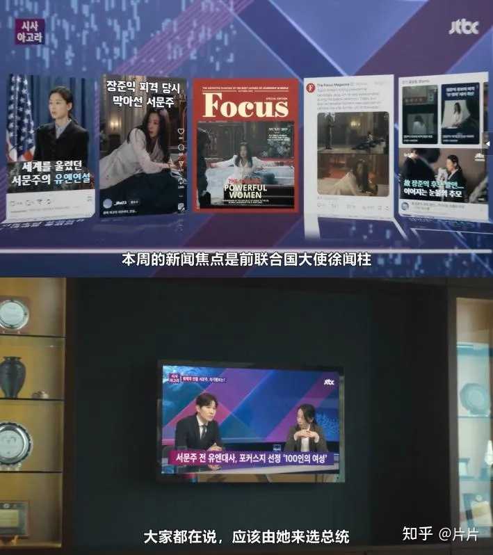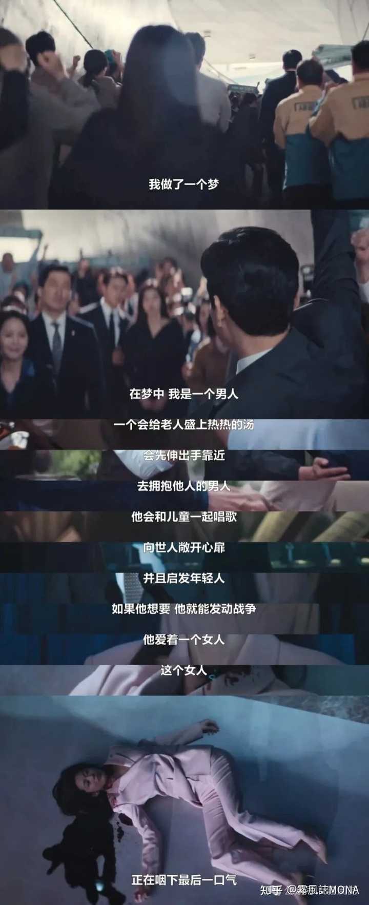 徐闻柱以第一人称讲述她做了一个梦,一开始镜头中的“我”只有背影,以及各种背景中虚焦的脸,而“梦中的我”即男人的脸是清晰可见的。徐闻柱描述的这个男人正是她的丈夫——准备竞选韩国总统的政治人张峻翼。 随后镜头终于越过张峻翼对准了他身后的女人徐闻柱,不料下一幕她就被枪击倒地、血流成河——“这个女人正在咽下最后一口气”。 这个颠倒、诡异的梦,代表着徐闻柱潜意识中想要成为她丈夫,结合后面的剧情会知道,她学生时期的梦想是成为总统。长大后她凭借实力走上外交之路,还当上了联合国大使,如今却因为丈夫要竞选总统,她卸下官职回到韩国,回到丈夫身边助力他竞选。 |