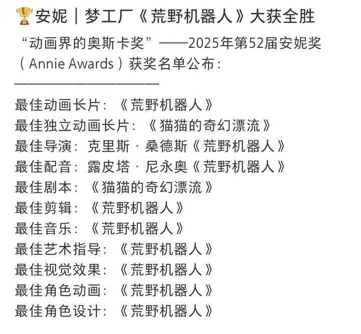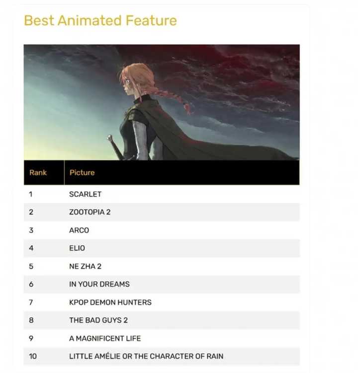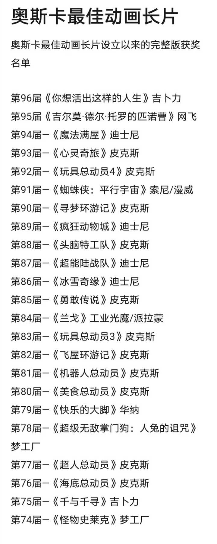 《荒野机器人》只能说完成度很高,但剧情还是太套路了,至于《头脑特工队2》,一个毫无新意的续集片压根就不可能颁给它,颁给猫猫挺好,鼓励小众独立动画。(上届提名的最佳动画长片有《猫猫的奇幻漂流》《头脑特工队2》《蜗牛回忆录》《超级无敌掌门狗:企鹅的复仇》《荒野机器人》。) 今年的动画长片提名,外媒也有预测, |