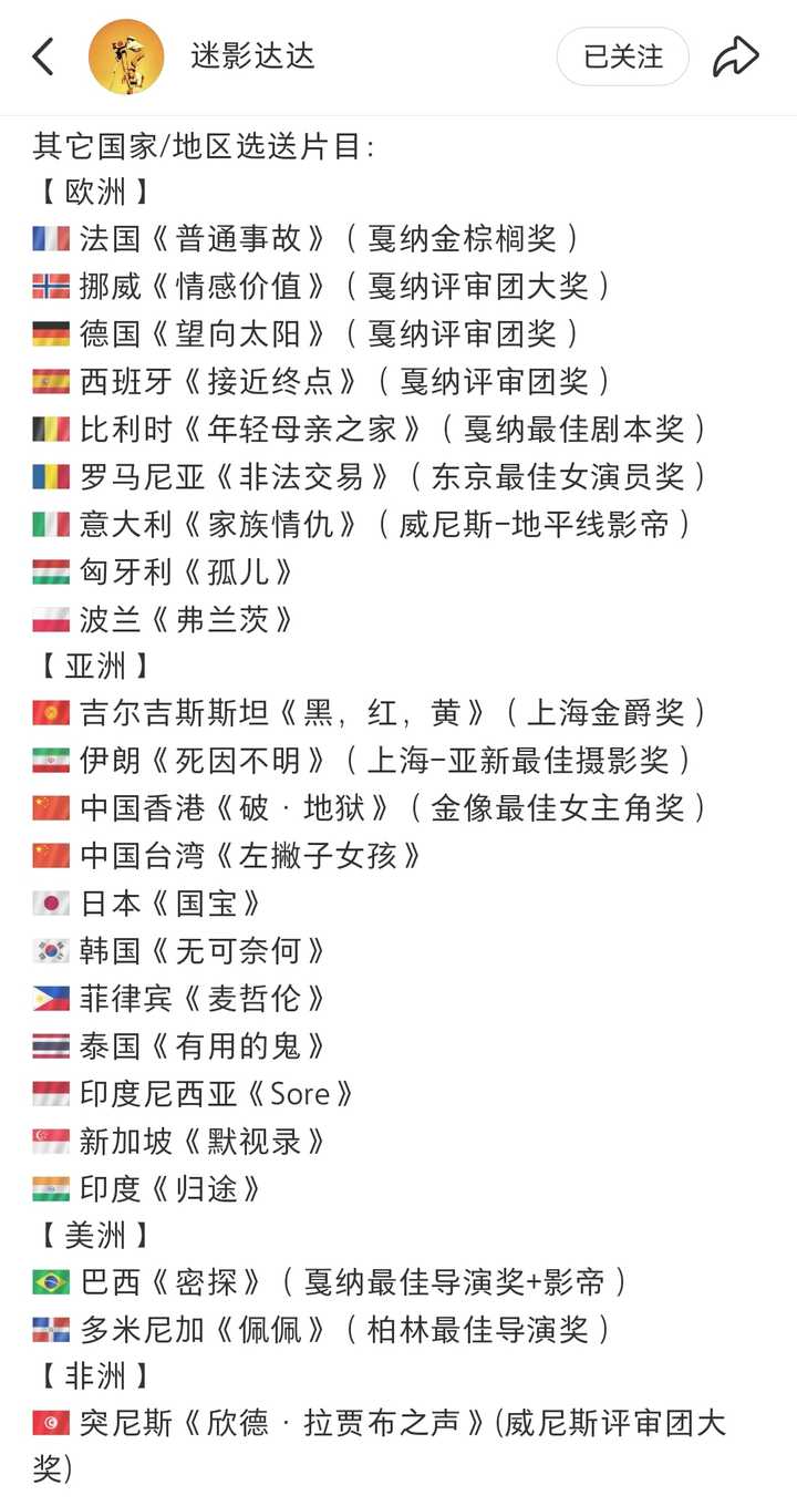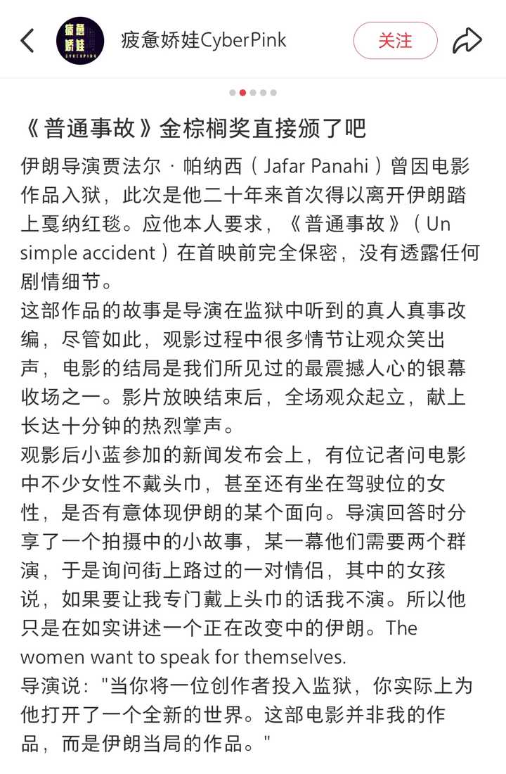 台湾的《左撇子女孩》入围过戛纳影评人周单元。 不过这俩都是平行单元啦,导演双周单元和影评人周单元——不属于戛纳电影节主办,但同时期举行,由导演协会以及影评人工会组织并设有奖,能挖掘出新锐导演,但总归,主竞赛才是最重要的。 这么看下来亚洲得奖概率也一般,不会两岸三地的华语真还算可以的吧。 哦对,忘了,伊朗导演贾法·帕纳西自编自导的《普通事故》拿下了戛纳的金棕榈的(去年奥斯卡金像奖的《阿诺拉》也是金棕榈),只是因为法国制片国之一嘛,所以法国也可以报。 |