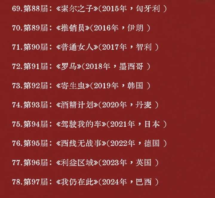 能不能拿奖?从题材而言,其实希望是很大的。但是从意识形态而言,希望真的不大。 别以为美国真的很民主很自由,人家也是玩自己的一套规则。 这个奖要不要给我们,多多少少美国还是要考虑考虑它儿子(美日同盟)的意见的。 先说回从题材而言,其实希望很大是什么意思。 你看看这几年奥斯卡获奖的国际影片。 2024年是巴西的《我仍在此》。 |