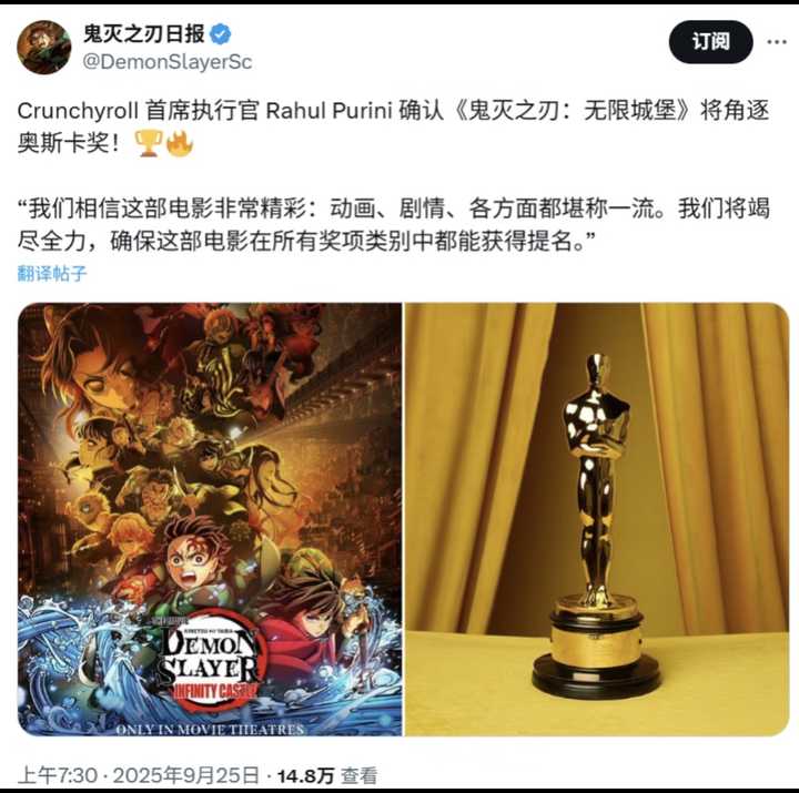 《哪吒2》虽然在特效、美术、动作等各个方面进步很大,能与迪士尼制作相较了,但其实动画风格特色突出性的话,恐怕《深海》的水墨3d更能抓住其他文化区的眼球。 论在北美市场表现,则是远不如《鬼灭之刃2》了。 当然这说不定反而让《哪吒》成东方奇观的小众片了对结果起到的影响也不一定是坏的,毕竟上届猫猫的票房几乎可以说是没有。 不过先不谈《鬼灭之刃》,《疯狂动物城2》应该才是最后的最大热门。 就看A24那边能不能运作到,一个提名吧,毕竟之前他们发行的是这些电影,还是有路子—— |