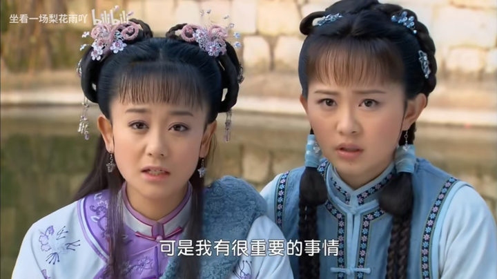 下面三图是《新还珠》小燕子一行人和紫薇第一次见面的穿搭,从衣服材质和发饰上,会发现小燕子衣服除了袖口窄点(方便干活),衣服材质是不输紫薇的,像盘扣也和紫薇一样是珠子的。 |