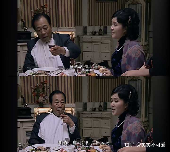 这就说明了两件事:1、梅姐是乡下人;2、翠平的表现就是乡下人第一次穿旗袍的正常表现,甚至梅姐年轻的时候第一次来城里穿上旗袍,可能也是这个反应。 再看站长擦嘴,就明白了,人在紧张的时候,人中是会出汗的,站长其实在擦人中的汗,因为他条件反射回忆起梅姐刚来城里的时候粗野的样子。 没错,站长是想看看翠平的条件反射,结果翠平先给他整条件反射了。 站长此时对翠平还有怀疑,但是梅姐率先放松了警惕,甚至要挨着翠平坐。 翠平第一次吃西餐,切不动不说,还看不懂菜。马太太抢先回答了牛排沙律罗宋汤,梅姐就开始阴阳怪气了。 |