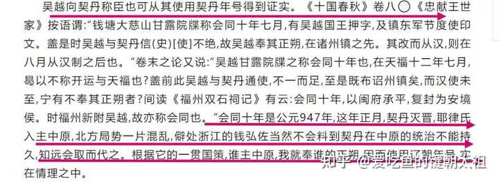 我看到未来的末代吴越王钱弘俶在汴梁朝廷义愤填膺为后晋皇帝说话,参与抗击抓捕后晋皇帝的契丹大辽的内容就忍俊不禁。 着实有一种汪精卫在南京为蒋介石出气痛骂日本侵略者的感觉。 为什么了呢? 因为中原五代十国时代,南方最早,最积极和契丹人接触的国家,不是别人,正是吴越国! 他浙江大学历史教授自己搞的考证文章写得明明白白: |