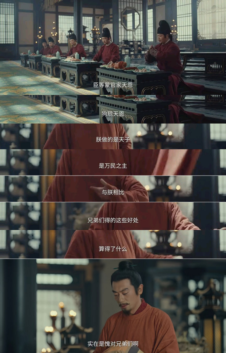 杯酒释兵权,朱亚文是在编剧的框架调调里发挥出了极致了,演技救了剧本一下,一开始说笑扯出话题,然后提到黄袍加身,佯装要给各将披黄袍,实则压迫感十足,众将拜服,赵大又语重心长地唠起家常,谈起担忧,“朕不能负尔等,亦不能负天下人”,用太平年大义压之,同时与赵二配合,许以众人富贵,恩威并施,让众人心服口服。 |