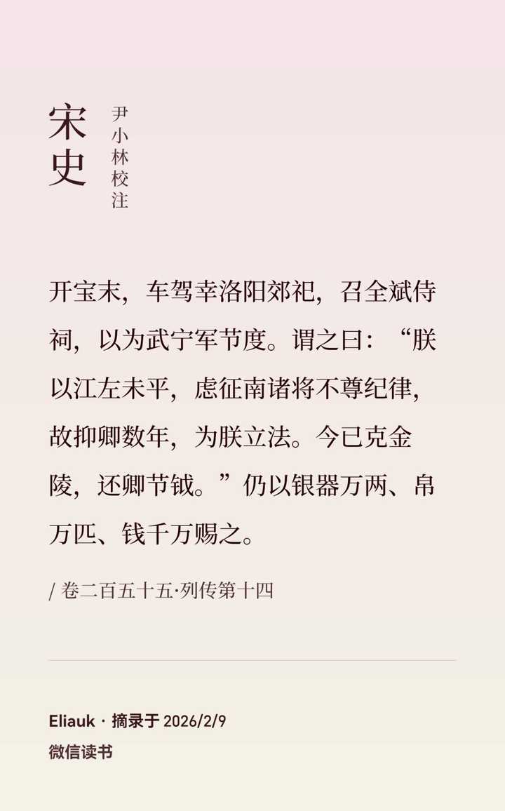 后面更是起用王全斌为武宁军节度使,再为大将。说:“朕以江左未平,虑征南诸将不遵纪律,故抑卿数年,为朕立法。” 意思是之前天下未定,怕不给你惩戒其他地方的人拼死反抗,所以委屈你一下,你要理解我官复原职吧。 这件事历史上是发生在杯酒释兵权之后的,算是赵大建国初期对武将处理方法的延续,赵大夺了那么多人的兵权,是怕他们这些人出乱子,所以有这种污点让赵大小施惩戒为最佳,百姓怎么样哪有哄好这些武将重要。但编剧这么改编,显然是觉得赵大这种只会砍人的兵子王不可能自己想出杯酒释兵权这种法子,才安了个不伦不类的司马浦快速上线劝谏实现杯酒释兵权后快速下线。看似美化,感觉实则还是没塑造好赵大。 尤其是后面的“卧榻之侧,岂容他人鼾睡”典出《桯史·徐铉入聘》,这就是直接对徐铉说的,怎么成对西南孟氏所言了,这就是当时俩人对话赵大生气了霸气侧漏脱口而出的一句豪语,这么微声细语的,真的是有辱赵大。 而且前面才说了,你刚说完这句话,川蜀孟氏投降了,你就把别人杀了数万人,然后还不惩治王全斌,现在又对南唐说这句话,这是生怕人家不拼死抵抗啊,这个就是对南唐的威慑,根本没必要安一个这是对后蜀说的话啊。 |