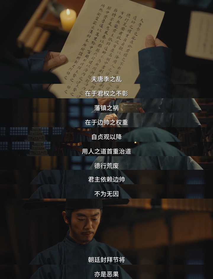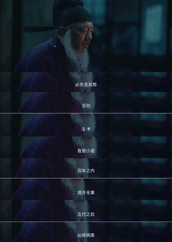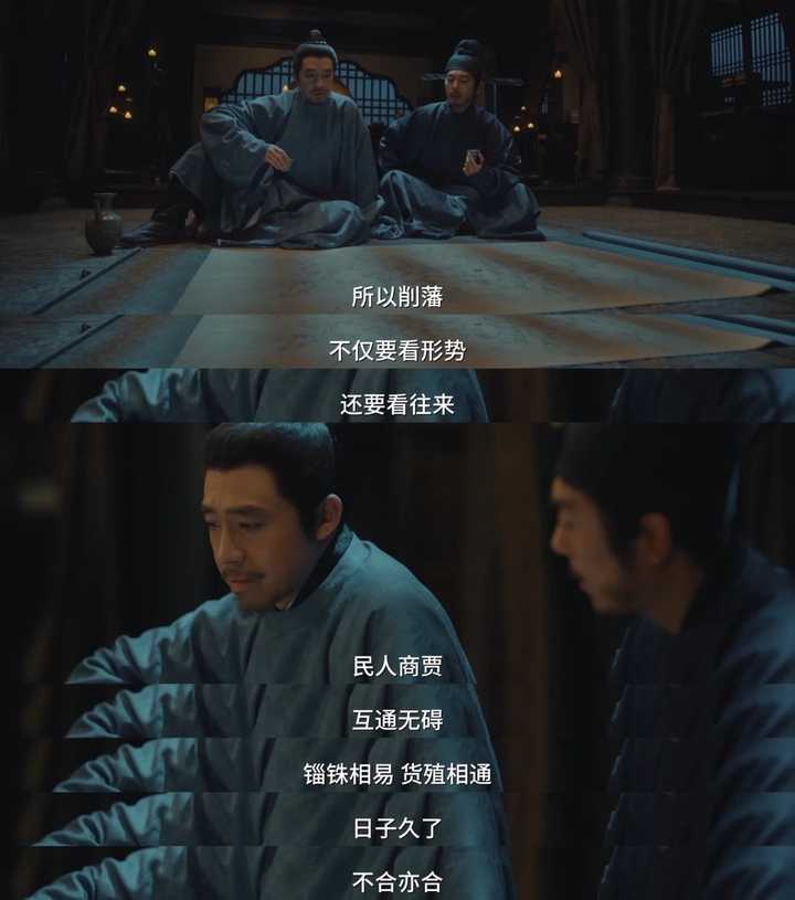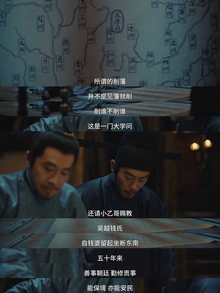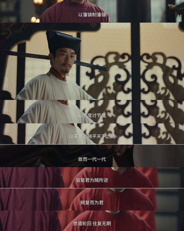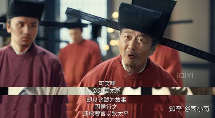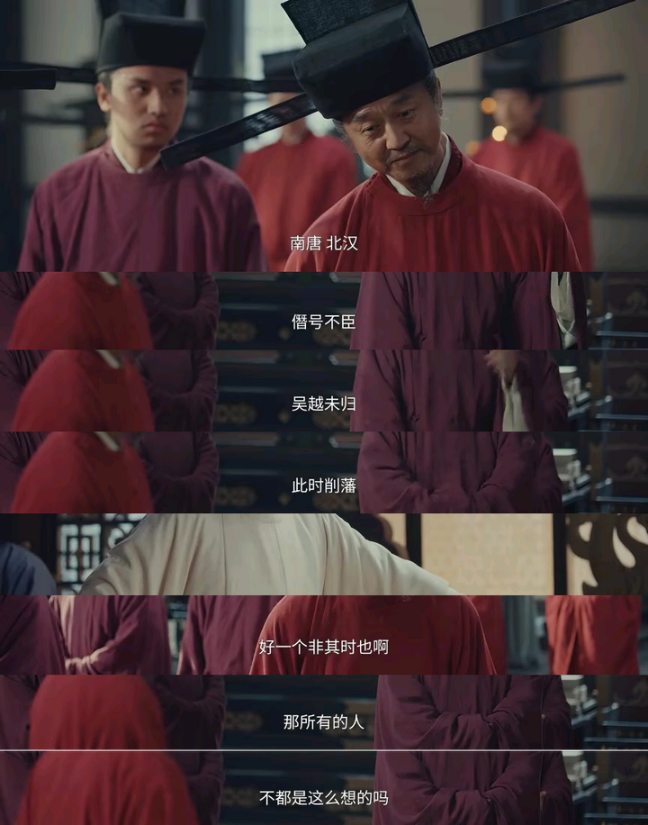 后面,直到小九看到周世宗实录,看到赵大修史,修史即为认正朔,九郎知道不是篡位而是不得已而为之,才解开心结了。 其实上面的陈桥兵变完全不是重点,毕竟只用几幕就快速划过去了,这部剧的重点永远在于太平年的塑造。 所以今晚的重点其实在削藩。 前几集铺垫的郭威冯令公、郭荣赵大谈论削藩的东西这就呼应上了。 这里一位破格录取了一位四十年不中进士脾气暴躁上朝吃零食的小老头司马浦当场提议削藩—— |