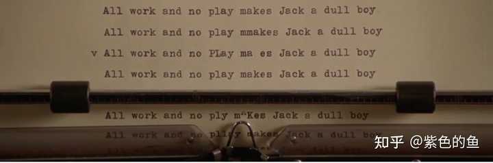 暗示:这里的东西不是用常规财富可以买到的,你有可能被我们接纳,但是现在的你还没有权利接触更多的幕后信息 2、侍者格雷迪(前任管理员):现在已经成了酒店的一部分,在自我介绍时被杰克认出,一开始自称对杀害妻女没有印象。格雷迪提到杰克一直都是这里的管理员,而他的儿子丹尼正在把外人带过来(指黑人老哥正赶来营救丹尼和温蒂),需要被"纠正",格雷迪的女儿和妻子层级想要烧掉酒店,而他“纠正”了她们(非常冷静的说出了自己干的事,他一直都记得)。 暗示:想成我们的一员就交纳投名状,而深层政府不能收到威胁和损害,如果外人知道了就要除去,不管是黑人老哥还是你的儿子,除去他们就是你的投名状。另外格雷迪的英文名称发音与greedy(贪婪的)相通,也暗示了酒店/深层政府的本质就是贪婪。 细节8(再大胆假设一些):杰克代表的真正身份的暗示 电影里最惊悚的一幕,就是温蒂发现杰克每天的创作,厚厚的书稿里只有一句话,All work and no play, makes Jack a dull boy(只工作不玩乐,让杰克变成个傻瓜) |