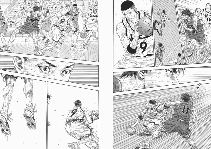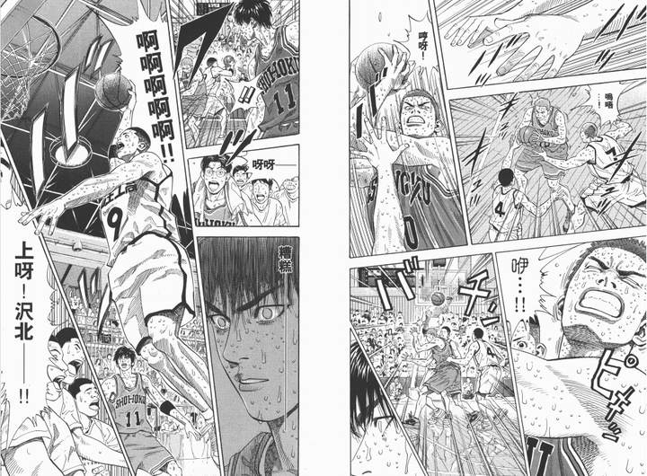 动作越来越夸张,人物的形体比例已经不成人样,看上面这张截图,大家就能知道为什么很多粉丝对这漫画有很大意见了吧? 这比例身材,已经不是正常人的状态了。 反观看灌篮高手,后期的漫画是越画越好,分镜、人物、场面都已达到体育类作品的巅峰。 |