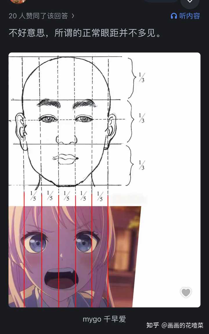 科普一下吧,三庭五眼指的是写实比例下,人脸横向有五个眼睛的距离,其中抛去俩眼睛,眼间距是一个眼,两眼到耳朵各自是一个眼。 当然这是黄金比例,实际上大部分人没这么标准。 而日漫二次元呢,因为要夸张大眼睛,所以显然横向放不下五个眼了,但二次元还是要符合眼间距标准,眼间距必须是一个眼,不然不好看。 这点迪士尼式美卡也是沿用的,基本都是一个眼 |