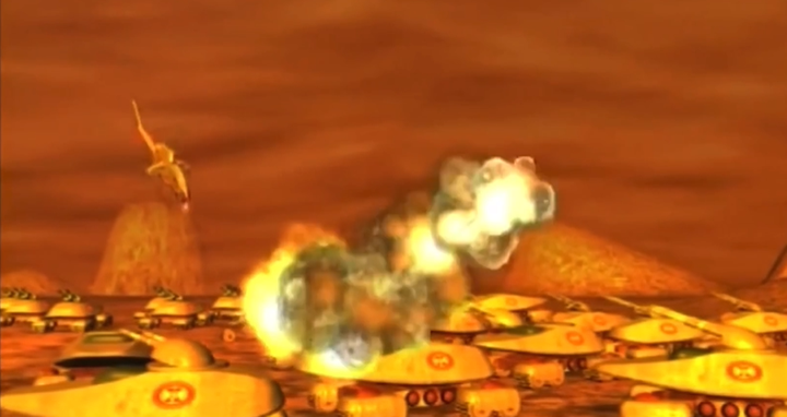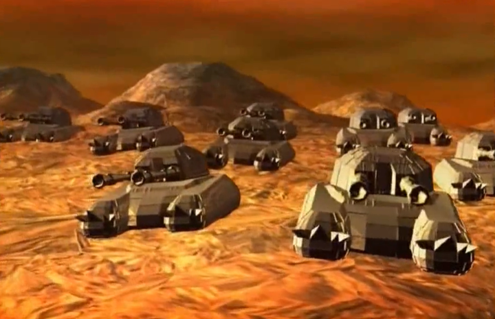 我记得第一集他们就聚集了数目非常庞大的坦克军团组成”坦克阵“来轰击外星基地;在幼小的我的心里,衡量战斗力的标准也就变成了这种“坦克阵” |