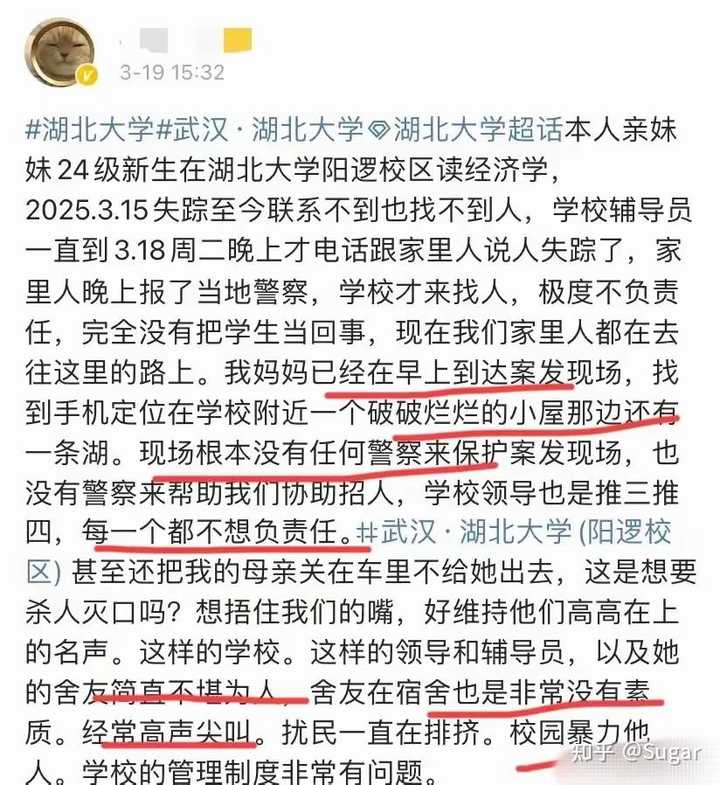 [教育信息]湖北大学通报女生失联事件,女生尸体在学校附近水域被发现,家属称此前未发现女生有轻生想法,具体情况如何? |