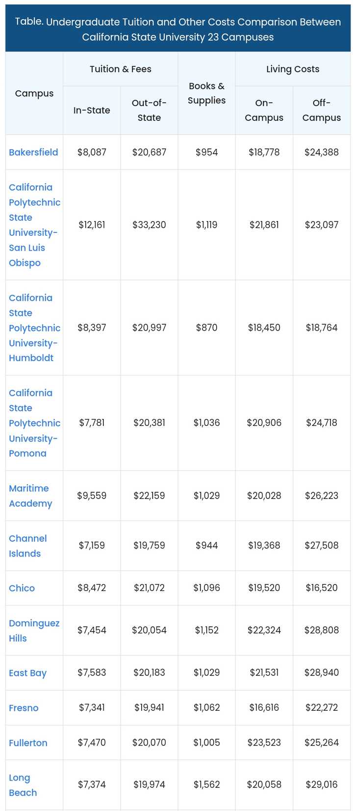 少年,你也知道加州大学系统的费用高(今年学杂费已经上两万刀了),那么我们就以加州州立大学系统(California State University)为例吧,下表是加州州立23个校区的“直接费用”,也就是“刚性支出”对比,包括学杂费、图书材料费和住宿费三项。(注:表我没截全,不过其他校区也都差不多) |