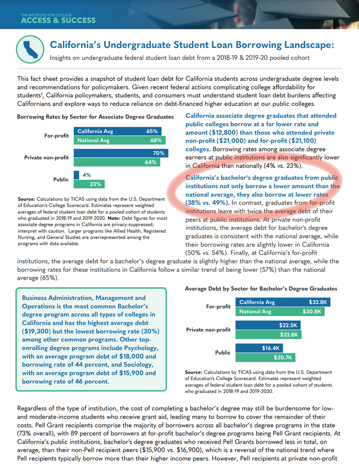 看看,生均可申请到的资助额高达16533,而其中“不需要偿还的奖助金”部分高达13380,简直不要太爽!不过您先别急,往下看最后一项:“一个学生毕业时通常需要偿还的贷款”是14595。等等,我数学有点不好,这里外里算下来没“赚头”啊? 有人会问了,我只要奖助金不要贷款不就好了吗?你校方不能强制吧?校方当然不能强制,人家只会抱歉的告诉你,把包拆开了我们就不能提供这么多奖学金了哦,你这要求就好像商家说满200减100,你说我不要商品你直接给我100吧…别看您长得丑,想的倒是挺美。 所以实际上即使是公立学校,也不可能轻松没压力,从下面这个加州本科学生贷款借贷情况的分析可以看出,加州公立本科生中依然有38%的贷款率,接近4成人需要借贷,这已经是最好的州了,而全美公立教育本科生借贷率高达49%。更重要的是,这个统计还是疫情以前的情况,以现在加州一边砍教育预算一边涨学费10%的现实来看,恐怕借贷率早就飙上去了。 |