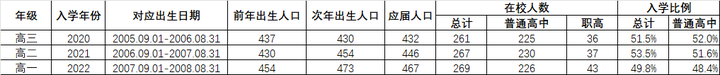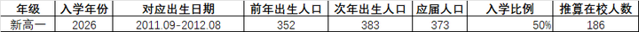 注:职高2022年入学有7名合作办学的外地生源,统计时予以扣除 根据数据我们可以看出,对应分年的出生人口大致有一半能上普通高中。我们再以这个规律推算一下2026年9月即将进入普通高中成为高一学生的人数: |