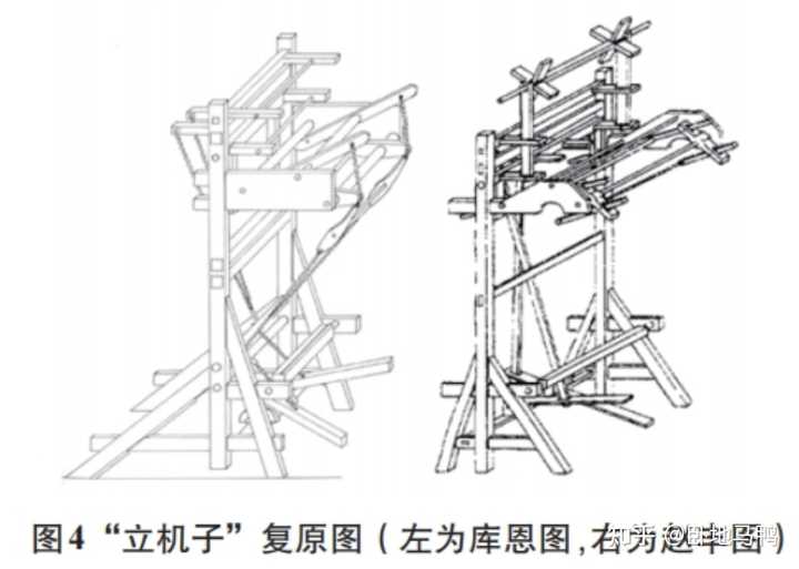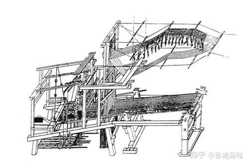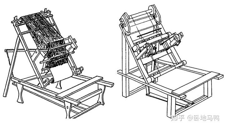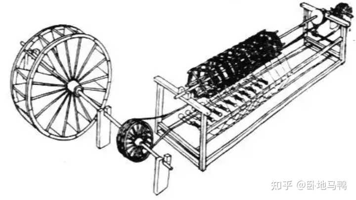 2.多管条播机 单管条播机最早发明于四千多年前的两河流域,但此后却并无创新。在中国发明耧车后的上千年内,其他国家和地区要么仍在使用单管条播机,要么还在使用人力播种,效率不及耧车的十分之一。而欧洲直至18世纪,才首次掌握多管条播机的相关技术,由荷兰人创新或引进(1701,Jethro Tull Drill) 3.水排 在杜诗发明水排之前,冶铁作坊内多以人力推拉鼓风,大量的人力和畜力被用于简单的鼓风工作。而在水排发明以后,因其日夜不停运转,每天可足足节省上百名劳工,且能让生铁产量轻松达到 3 吨以上。 而同时期哪怕几个世纪后的欧洲,依旧依赖用羊皮风箱进行人力手动鼓风,效率低下,费时费力。类似的水力鼓风机更是直到16世纪才在欧洲得到推广(1588,Ramelli,Diverse and artificial machines) 同时,该机械也是世界上最早的水轮鼓风机,通过曲柄摇杆结构做功,将回转运动转变为连杆的往复运动。与工业时代蒸汽机中曲柄摇杆结构的原理一致。 4.斜织机 斜织机最大的创新,在于其演化出了全球最早的踏板结构,让织工可以手脚并用,一边用手控制经纬,一边用脚踩动多条踏板,联动控制综片升降,极大地解放了生产力。而在本土,该机械也被一直沿用至近现代,被作为手工业的主要纺织工具。 而直到公元10世纪,欧洲所用的纺织机械还是一种极为原始的双轴织架,基本结构与我国新石器时代的腰机一致,效率奇低无比。而欧洲直到公元13世纪,才从西亚引进这种踏板卧式框架织机,并且这种机械甚至可能源自中国: The earliest European pictorial record of the horizontal frame loom with a treadle dates from the 13th century, when it appears in a highly developed form, almost certainly introduced from the East. ——摘自Britannica(大英百科全书) |