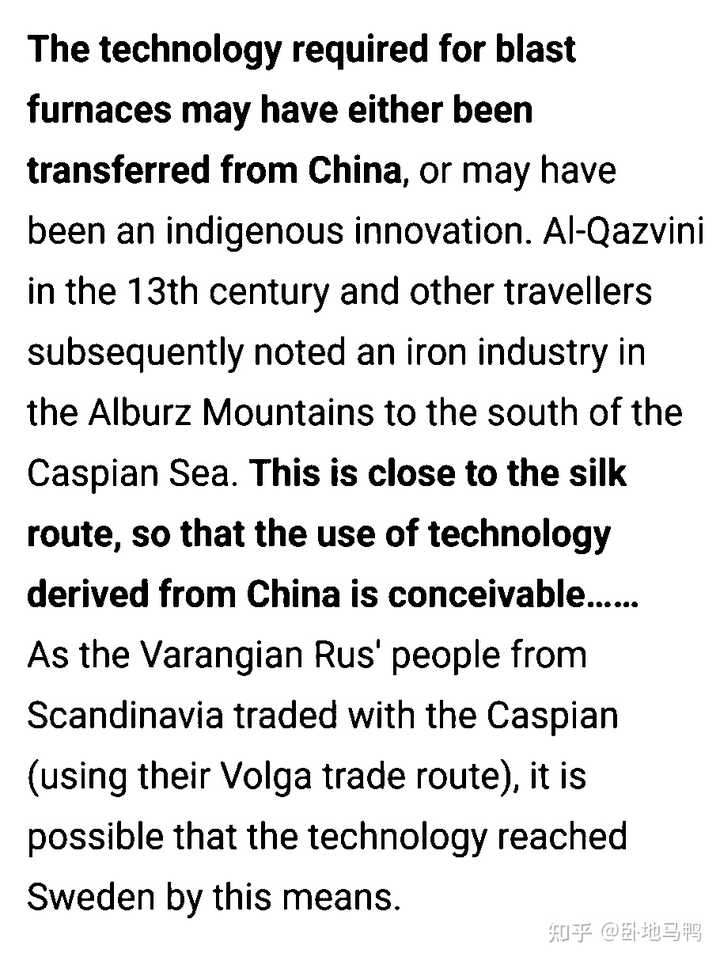 公元6世纪 高转筒车而这几项技术的含金量有多高呢?1.冶铁高炉及生铁冶铸 在公元前2世纪的古荥冶铁遗址中,单个高炉推测日产生铁可达1吨左右,炉温达1300℃,清扫出的炉前积铁总量近百吨,其中最大单块重达23吨。 而欧洲直至公元12世纪才出现冶铁竖炉(1150,Lapphyttan),在公元14世纪才出现冶铁高炉(Blasofen),直至公元16世纪才将这一技术普及。在此之前欧洲只有极为原始的吹炼炉,连液态铁水都难以冶炼。 该项技术是近代高炉的直系祖先,是近代炼钢技术的重要基石之一。正因为此,欧洲才开始掌握生铁冶炼技术,进入液态冶炼时代。17世纪英国通过煤基高炉技术实现大规模钢铁生产,这一技术革新大大带动了工业革命的冶炼发展。 欧洲人认为这一发明正是由中国传入西亚,再经伏尔加商路传入欧洲: |