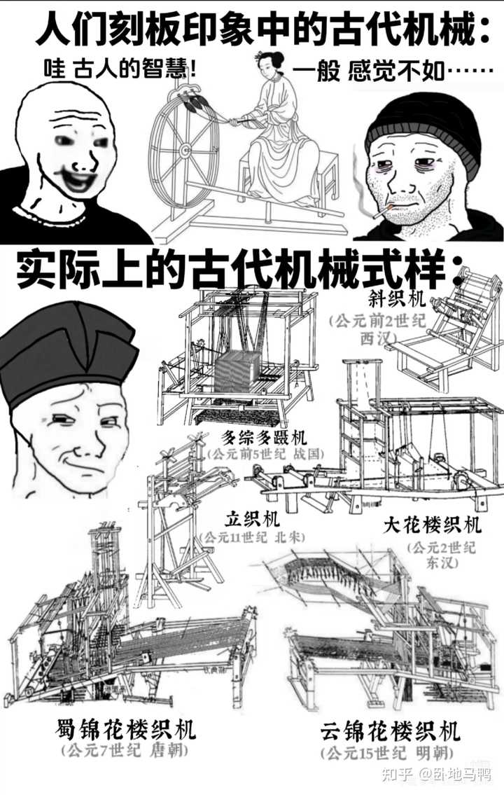中世纪欧洲与同期中国宋朝使用的织机对比5.提花机 正如上文所述,提花机本体的设计非常超前,并在此后的两千多年中不断迭代,演化出大量的改良版本,用于不同织物的织造。 而欧洲出现类似机械,要等到18世纪,由法国工匠贾卡(Joseph Marie Jacquard,1752-1834)创制,于19世纪进行改良,以蒸汽机械作为动力,变为自动提花机。这种机械也启发了二进制计算机的诞生。 总而言之,你可以说古代中国不重视“理”,但绝不能说人家不重视“工” 不重视机械的从来不是古代中国,而是某些知识浅薄,却不愿认真学习,反而道听途说对自己祖先无限贬低的人群。 最后,附上这么一张图: |