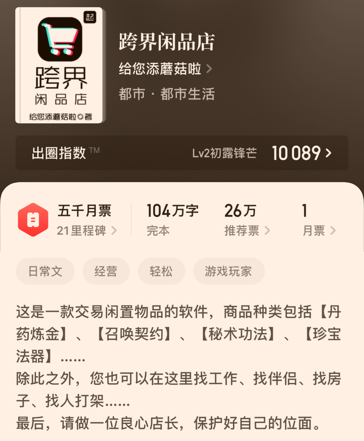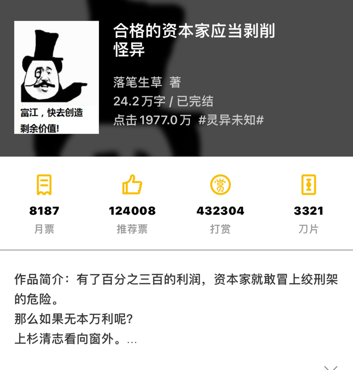 更新一本,这本书胜在文笔好,每个支线都给人一种恍然大悟的感觉,故事节奏较慢,主角济公相似版,做事不留名,只留下传说。设定里下的不是普通的棋子,而是生灵与命运,强推!!! 21.《合格的资本家应当剥削怪异》 |