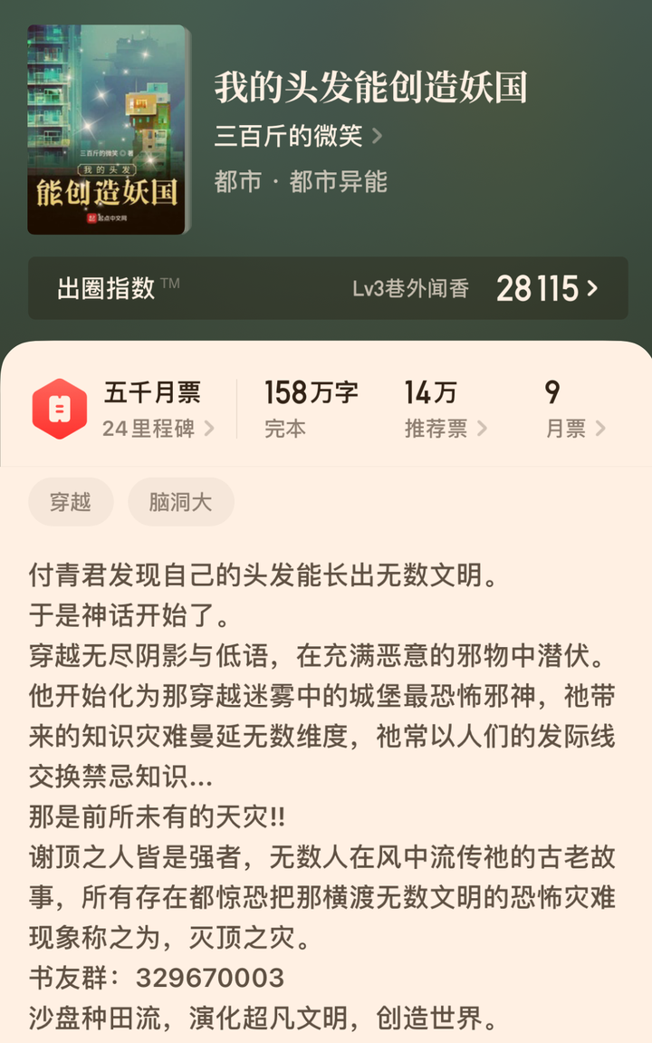 沙盘流。主角是个万恶的资本主义家(不),通过梦境压榨劳动力创造新世界,谁曾想新宇宙竟能反过来影响现实,甚至更像是真正的“历史”。(世界观包含神话,西游,大唐,天庭,魔幻,科幻,机械文明等) 2.《我的头发能创造妖国》 |