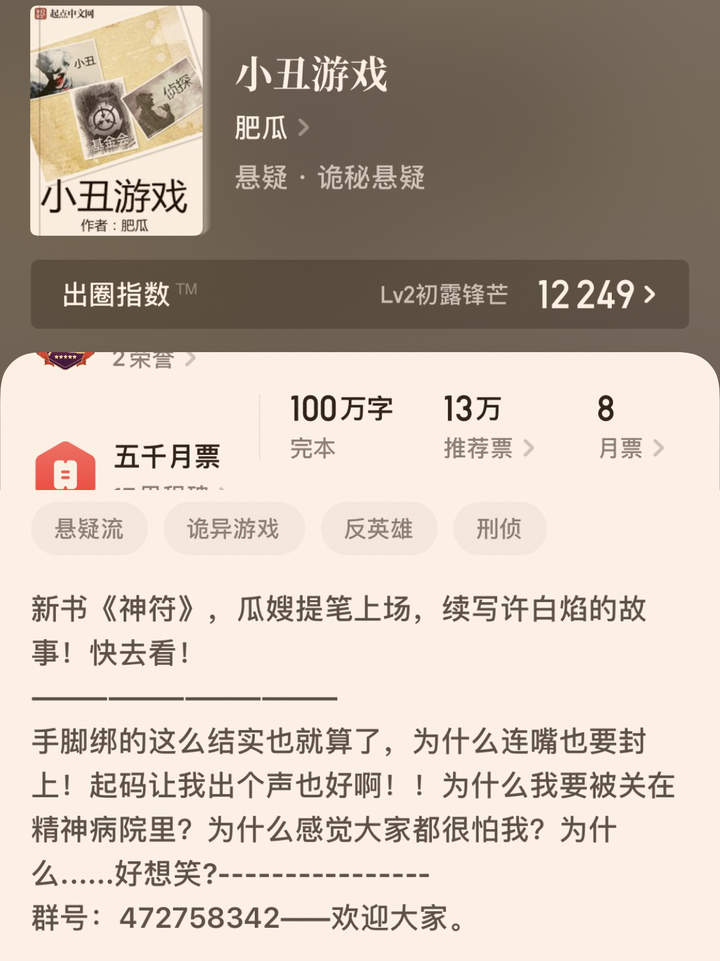 啊居然没有简介,那我简单说下,金手指设定非常有趣的一本书,和《永远也讲不完的故事》很像,主角拥有一本能够和读者(对也就是你们!)交流的书,通过读者评论进行破案。(好家伙抄书评抄得光明正大哈哈哈哈),这篇我没看完因为记得中间停更了,还会继续把它看完的嗯! 9.《小丑游戏》 |