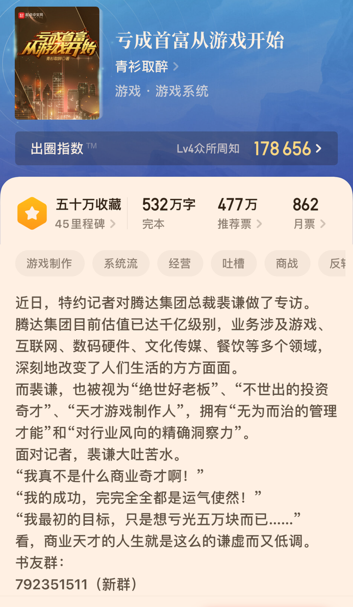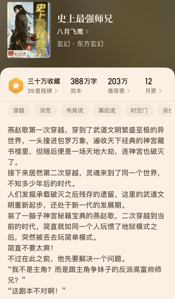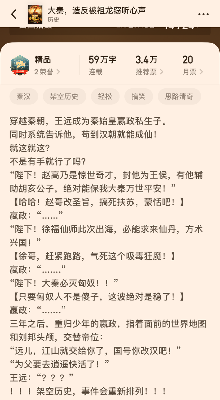 无敌文,没追完,后面水,前期值得一看。喜欢看无敌文+文娱类的也可以看《全职艺术家》,前期有趣,文笔可以,作者会铺节奏,就是后面水如汪洋大海,我追到后面只看目录就知道在讲啥了,所以就不看文章了(狗头保命) 16《大秦,造反被祖龙听见心声》 |