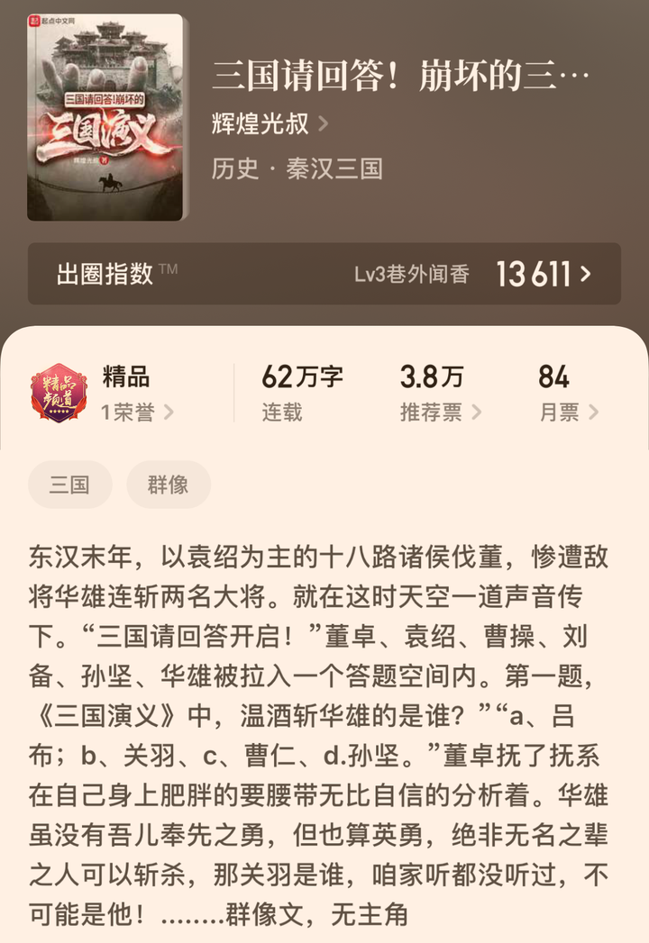 同一个作者!仙草!牛顿的初期副本刚完,还在追中可以养!强推!作者涉及学术非常严谨……经常引用论文还附doi太可爱了。 6.《三国请回答!崩坏的三国演义》 |